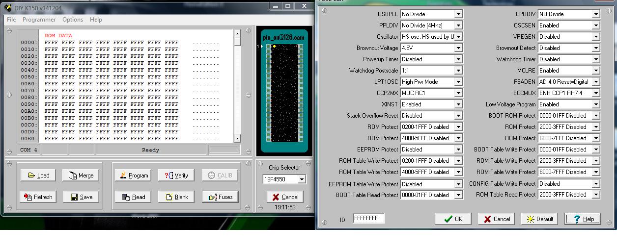 Hallo, da ich von Phillips Ambilight begeistert bin habe ich mir bei Ebay die Ausgabe 2/2008 vom Elektor besorgt in der die Schaltung dafür ist. Vorab, ich habe mir alles was mit Elektronik zu tun hat selber beigebracht und löte "relativ" viel für Bekannte und Freunde. Einfache Schaltungen denke ich mir auch selber aus. Das TV-light ist für mich jetzt das größte was ich gelötet habe und auch die erste Schaltung mit ICs die ich Programmieren muss. Dafür habe ich mir den Brenner "PIC K150" direkt aus Hong Kong bestellt. Mittlerweile habe ich alles auf einem Lochraster fertig aufgebaut und auch nach dieser Anleitung getestet. http://www.steffenschuette.de/steffenschuette/elektronik/tvLight/bauanleitung.htm Laut meinen Oszilloskop sollte soweit alles passen doch jetzt geht an an das Brennes des PIC16F628 und des PIC18F4550. Beim PIC16F628 hatte ich keine Probleme. Habe mittels meinem Brenner die Datei "rgb_led_controller_16F628.HEX" draufgespielt. Beim PIC18F4550 habe ich auf volgender Seite schon gelesen das ich die Config-Bits noch einstellen muss. Doch davon habe ich keine Ahnung wie das bei meinem Brenner funktioniert. http://www.steffenschuette.de/steffenschuette/elektronik/tvLight/bauanleitung.htm Als ich die Datei "18f4550_boot_rb0.hex" in meinen Brenner einfügte und auf Brenner klickte öffnete sich ein neues Fenster in dem ich was einstellen muss. Kann mir jemand sagen was ich da machen muss?? danke