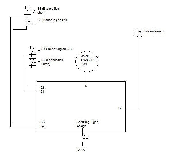 Hallo liebe mikrocontroller.net-Mitglieder, hier soll es um eine Realisierung der Steuerung eines Motors gehen, der eine Spiegelfläche hoch- und runter fährt. Dieser ist bereits eingebaut und erledigt die Aufgabe die ca. 10 Kg Platte inkl. des Spiegels hoch und runter zu fahren mit Bravour (Hochfahren dauert ca. 3,5 Sek, der Weg beträgt 50 cm.). Die Steuerung soll hoffentlich mit eurer Hilfe nun Schritt für Schritt realisiert werden. Im Anhang ist nur eine erste Übersichtskizze mit den nötigen mechanischen und einigen elektrischen Bauteilen und ungefährer Positionierung eingefügt (Trafo fehlt). Nun zur Erklärung der Funktion und Aufbau: ------------- Sobald ein handelsüblicher 230V Lichtschalter für den Sanitärbereich in Stellung "EIN" geht, wird die Anlage mitsamt eines Infrarot-Lichttasters aktiviert (Trafo wird eingeschaltet). D.h. die ganze Anlage muss in der zuletzt verlassenen Position verweilen, auch wenn vorübergehend keine Spannung anliegt. Voraussetzung 1) Wird nun eine Hand vor dem Infrarotsensor gehalten ODER durchgeführt, fährt ein Motor über eine Rollenmechanik die Spiegelwand hoch. Die Endpositionen werden hierbei von Endschaltern erfasst. Voraussetzung 2) NACHDEM DER SPIEGEL HOCHGEFAHREN IST, soll bei erneutem Halten/Durchführen der Hand über dem Infrarotsensor der Motor in die umgekehrte Richtung laufen und die Spiegelwand absenken. Voraussetzung 3) Während der Motor in eine beliebige Richtung noch läuft soll bei erneutem HALTEN (nicht durchführen) der Hand über den Infrarotsensor der Motor stehen bleiben (NOTFALL-Stop), wird die Hand vom Sensor wegbewegt, soll der Motor in die zuvor gefahrene Richtung bis zum Endanschlag weiterfahren. Zu PWM: Es ist möglich den Motor zwecks Geschwindigkeitssteuerung (da mangelnde Kenntnisse im Bereich Programmierung und PWM) mit zwei Spannungen (24/12V) laufen zu lassen da dieser eig. für 24 Volt ausgelegt ist, jetzt jedoch auch mit einem 12V Akku sehr gut läuft. Der Gedanke ist den Motor jeweils nahe der Endlagen etwas langsamer laufen zu lassen (also 12V) ansonsten aber etwas schneller (24V), wobei die Positionen durch zwei weitere Endtaster erfasst werden können (ist in der Skizze oben eingefügt). Dies könnte man doch mit einem 2ten Trafo erledigen statt PWM? ACHTUNG! Ich kenne mich mit PWM noch gar nicht aus und kenne den entsprechenden Aufwand und die Auslegung der nötigen Bauteile nicht. Evtl. wäre eine PWM-Steuerung zu übertrieben oder aber doch die einzig vernünftige Lösung? -------------------- Gegebenheiten Infrarotsensor (sollte demnächst geliefert werden): --------------------------- Industriestandard Licht im Infrarotbereich (nicht sichtbar) Spritzwassergeschützt Einstellbare Erfassungsweite bei ca. 1 bis 10. cm Sichere Erkennung einer Handfläche im Erfassungsbereich Zylinderförmiges Gehäuse Ub 11 bis 30 Volt DC PNP/NPN (Wechselschalter) Schaltausgang 200 mA ------------------------- Was ich nun gerne möchte, ist ein Anstoß zur Realisierung. - Soll die Steuerung komplett digital erfolgen und auf eine Lochrasterplatine aufgebaut werden? Soll es doch gewöhnlich mit Relais aufgebaut werden, wobei ich die Schaltung wohl selbst hinbekommen würde (bin nie mit der Porgrammierung von ATMELs o.ä. beschäftigt gewesen). - Welcher Trafo soll nun genommen werden (gehen wohl LED-Trafos, z.B. soetwas wie Ebay-Art.Nr.: 320633266622? - Was würdet Ihr verbessern, was würdet Ihr anders machen, wie würdet Ihr es letztendlich realisieren? Vielen Dank für Eure Hilfe und jegliche Anregungen im Voraus. Vitali PS: Soll sich etwas finden, was es als fertige Lösung gibt, oder sich jemand dafür bereit erklären die Steuerung zu verwirklichen, so bin ich selbstverständlich bereit Geld dafür auszugeben.