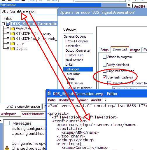 Ok, ich bin zu doof dafür. Trotz intensivem Bemühen, es geht hier nicht. Nun will ich mich von KEIL µVISION verabschieden... Ich wollte nun IAR ausprobieren. Jetzt bin ich aber wieder zu doof. Alle Beispiele des Workspace kann ich Flashen und Debuggen. Ich habe ein neues Projekt angelegt. Chirugisch die Zeichenfolge "DAC_Signals..." aus allen Quelltexten entfernt und durch "DDS_Signals..." ersetzt. Dieses Projekt habe ich dann in den Workspace eingefügt. Es kompiliert mit 0 Fehlern und Warnungen. Bei"1" im Bild habe ich erst 'mal den Kopf geschüttelt. "2" habe ich dann ein paarmal durchgeführt und dabei kleine Änderungen am Programm gemacht. Soweit so gut. Beim Debuggen gab es dann ein paar Ungereihmtheiten, bis ich dann feststellte, dass immer das ursprüngliche "DAC_Signals..." geflasht wird, der Debugger aber meine Änderungen anzeigt ? Bei "3" sehe ich nun, das neue Projekt kann nicht geflasht werden, alles grau. "2" macht nicht was ich erwarte. Was fehlt denn da ? Wo bin ich wieder zu doof ? Grüße Werner