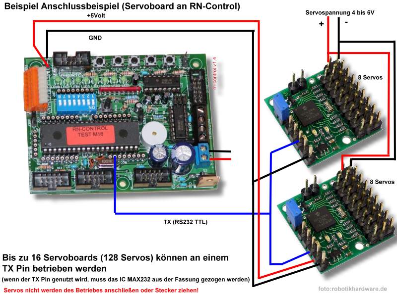 Hallo! ich Wollte mir ein RN-Control 1.4 von Roboterhardware.de kaufen. Dazu noch einen USB zu R232 Adapter und ein Micro Servo Board. Hier noch ein Link zum Servoboard (anleitung Englisch) http://www.pololu.com/file/0J37/ssc03a_guide.pdf Um das Servo Board mit dem Popolu Mode (spezieller Übertragungsmodus des Herstellers) nutzen zu können muss ich es über den Serial Output an den Pin PD1 (TXD, Controllerboard) wie in der Grafik (Anhang) verbinden. Dann steht da ich muss das IC MAX232 entfernen. Wenn ich das so mache wie und wo soll ich denn dan den USB Adapter anschliessen? Sehe ich das richtig, dass sich die beiden Gerätschaften ein wenig beissen, bzw. ich den RS232 andersweitig nicht mehr nutzen kann? Oder denke ich gerade falsch und kann das Servoboard einfach an z.B. PD3 anschliessen. Hoffe es hat schonmal jemand mit dem Micro Servo Controller gearbeitet und kann mir auskunft geben. Vielen Dank im Voraus