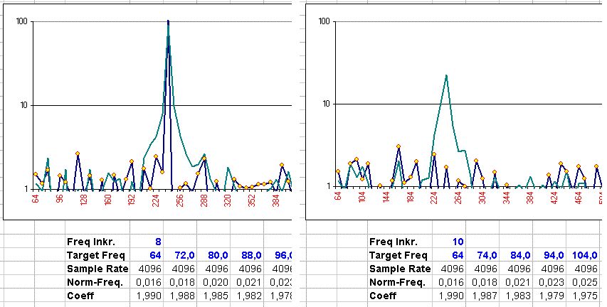 Mathegenie schrieb: > Was funktioniert nicht richtig? Siehst du Deine Frequenz nicht, oder > siehst Du gar nichts? Kann es sein, dass Du Deine Frequenz deshalb nicht findest, weil Du zu grob abtastest? Die Schrittweite der Testfrequenzen mit denen Du rechnest, muss in einem sinnvollen Verhältnis zur Samplezahl stehen, weil mit zunehmender Samplezahl die DFT-Rechnung immer selektiver wird und Dir so eine Frequenz durchrutscht. Ich habe im Anhang ein altes Beispiel hinkopiert: Die Schrittweite von 8 führt dazu, dass bei der blauen Kurve mit den Punkten die Frequenz einigermassen getroffen wird und sich ein peak bildet, bei 10 Schritten liegt man haarscharf daneben und der peak geht im Rauschen unter. Bei der gröber auflösenden, türkisen Kurve wurde die Berechung schon nach 2048 von 4096 samples abgebrochen. Umgekehrt führt die Überlegung dahin, dass Du Deine Sanplezahl nicht zu gross wählen darfst, wenn Du Deine Frequenz nicht genau triffst, oder Du bekommst eben das Ergebnis, daß das Matching gering ist. Techniker schrieb: > Würde es eigentlich Sinn machen > einen Bandpass FIR-Filter zu verwenden ? Der Bandpass ist nicht anderes als eine Summe von Frequenzen als Maske, die gleichzeitig auf den Datenstrom losgelassen werden. Mathematisch ist der Bandpass ein Hochpass, von dem ein TP abgzogen wurde. In den Koeffizienten zeigt sich das durch ein Integral der oberen Grenzfrequenz hin zu 0, von der der Koeefizientensatz unterhalb der GF weggelassen wurde. Wenn Du dir einander annäherst, hast Du am Ende eine Frequenz wie oben. Wenn Du Deine Frequenz nicht genau kennst, ist der BP gfs besser.