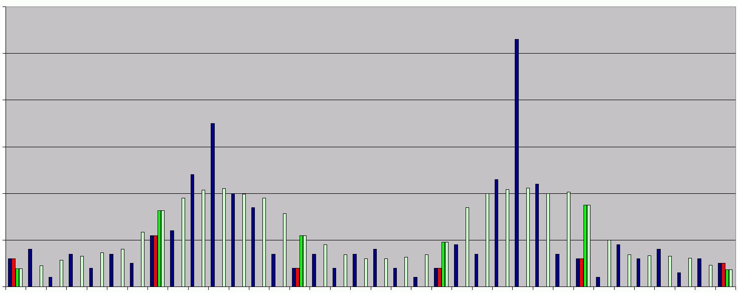 Techniker schrieb: > danke für deinen Beitrag. Du meinst ich taste zu grob ab. Auf einem > System kann habe ich nun mal pro Sinusperiode 128 Abtastwerte. Ich denke, wenn dann diesbezüglich "zu fein". Je mehr Punkte je Sinus, desto selektiver wird diese Maske, mit der Du den Datenstrom ansiehst. Wenn diese Punktezahl steigt, muss auch die "Maskenanzahl" steigen. In der Grafik habe ich das veranschaulicht: * Blau: Sehr genau abgetastet, man erkennt den Verlauf des Signals * Rot: Mit einem 7-tel der Aufösung abtastet: Das Maximum rutscht durch * Grün: Mit einem 7-tel der Auflösung bei 7-facher Breite * Hellgrün genau abgetastet mit 7facher Breite Der grüne ist also grob/breit genug, um das Signal noch zu erfassen und fein genug, um den Verlauf noch erahnen zu können. Blau wäre etwa die obere Grenze. Grün etwa die untere Grenze. .