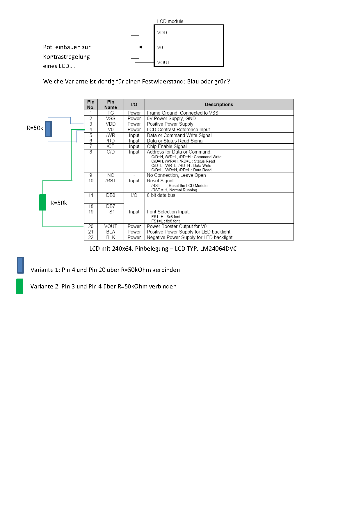 Du musst 2 Festwiderstaende einbauen. Du loetest beide an einem Bein zusammen, damit erhaeltst du einen Widerstand mit einem Mittelabgriff. Den Abgriff loetest du an V0, ein Bein an VDD, das Andere an Vout.