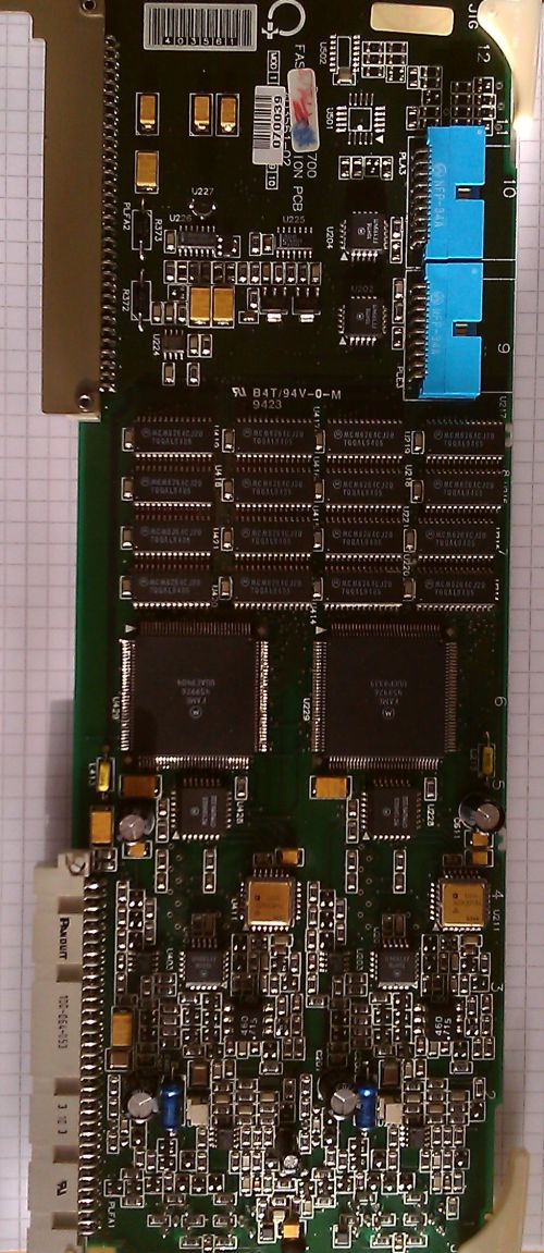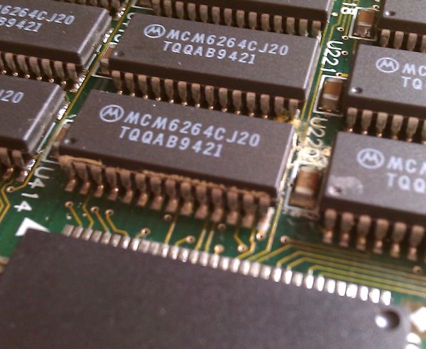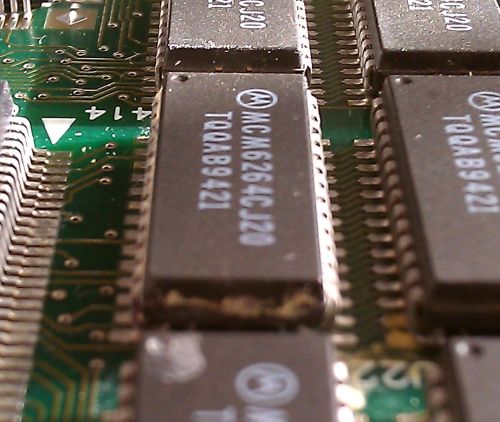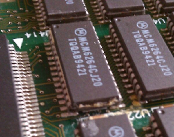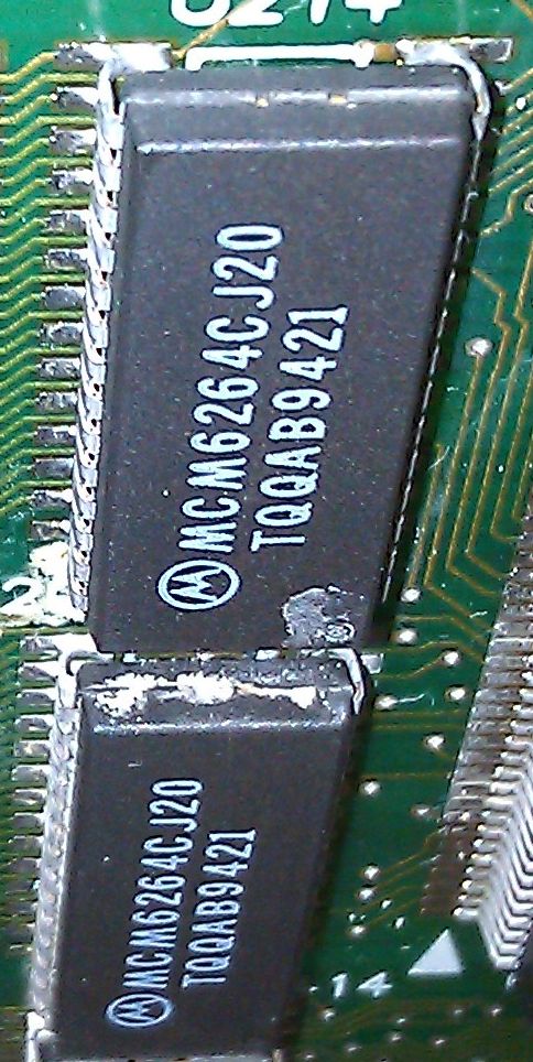 Hi, ich habe gerade in meinem Oszi (Gould DataSYS) zwei ICs gefunden die auslaufen zu scheinen. Sind, soweit ich das erkennen kann, "normale" RAM Bausteine, also nichts mit einer eingebauten Pufferbatterie. Kann es dennoch sein, dass da irgend ein Elektrolytcap verbaut wurde? Was könnte das sonst sein? Interessanterweise ist es bei den beiden identischen Boards jeweils genau der gleiche IC der betroffen ist obwohl pro Board 16 verbaut sind. Der einzige Unterschied zu den anderen ICs besteht darin, dass auf der Unterseite des Boards beim betroffenen Speicherchip ein IC sitzt, das wird aber nicht allzu warm..