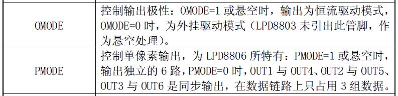 Hallo Karl, wird es noch eine Bestellung geben? Ich hätte schon Interesse an 5 oder 10m. Die teilweise Übersetzung des Datenblatts hat leider mehr Fragen als Antworten hinterlassen. Ein Arbeitskollege in China hat mir das folgendermassen übersetzt: lpd8806_page1: 3/6 channels programmable LED driver with 256 bit PWM. lpd8806_page2: Special clock regeneration and SIGIO capability with cascade length of 2000. Build-in 1.2M oscillating circuit with Free-Run mode, better for PLC design. (flash frequency ≥ 4000HZ) Each channel with independent build-in 256 bit PWM grayscale control circuit with effect of 1024 gray level after programming. lpd8806_page3: OMODE: When OMODE=1 or vacuum, output mode is constant current driver. When OMODE=0, hacking drive mode(LPD8803 without this output and treated as vacuum) PMODE: Special for LPD8806: PMODE=1 or vacuum, output is independent 6 way. When PMODE=0, OUT1 & OUT4, OUT2 & OUT5, OUT3 & OUT6 sync output and take the 3 groups data on data chaim.