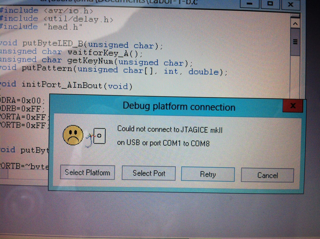 Hallo, ich sehe zwar einen interessanten Kabelverhau, aber ich sehe kein serielles Kabel an der RS232-CTRL des STK500. Damit wird das aber mit dem PC verbunden... Du wählst COM5 als Anschluß des STK500 an, das wird ohne Anschlußkabel wohl kaum Sinn machen. Ein STK500 hat keine Debug-Unterstützung, Du kannst als Debugger nur einen der beiden AVR-Simulatoren in der Software des AVR-Studios auswählen. Gruß aus Berlin Michael