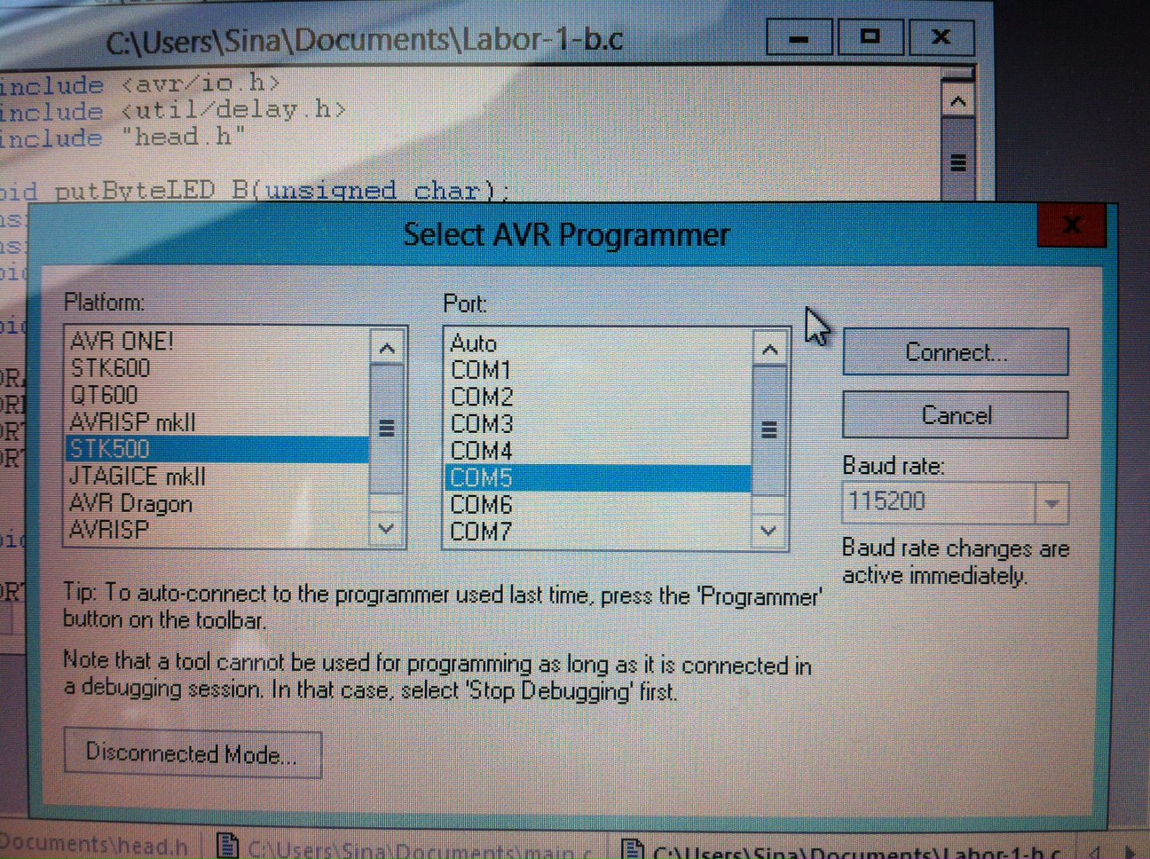 Hallo erstmal, Ich versuche seid Tagen mit dem Programm AVR 4.0 der STK500 über USB zu verbinden. Leider waren die Prof. in meine Uni nicht die große Hilfe. Meine frage ist also. 1. Habe ich alles richtig an STK500 angeschlossen? 2. Was muss ich an mein AVR Programm wählen damit er die Verbindung herstellt? 3. Warum leuschtet der LED 9 die ganze Zeit? Ich bin noch ein Anfänger im µP und versuche so viel wie möglich zu lernen und für jede Hilfe dankbar. Vg, Sina Im Anhang sind paar Fotos zu Verdeutlichung.