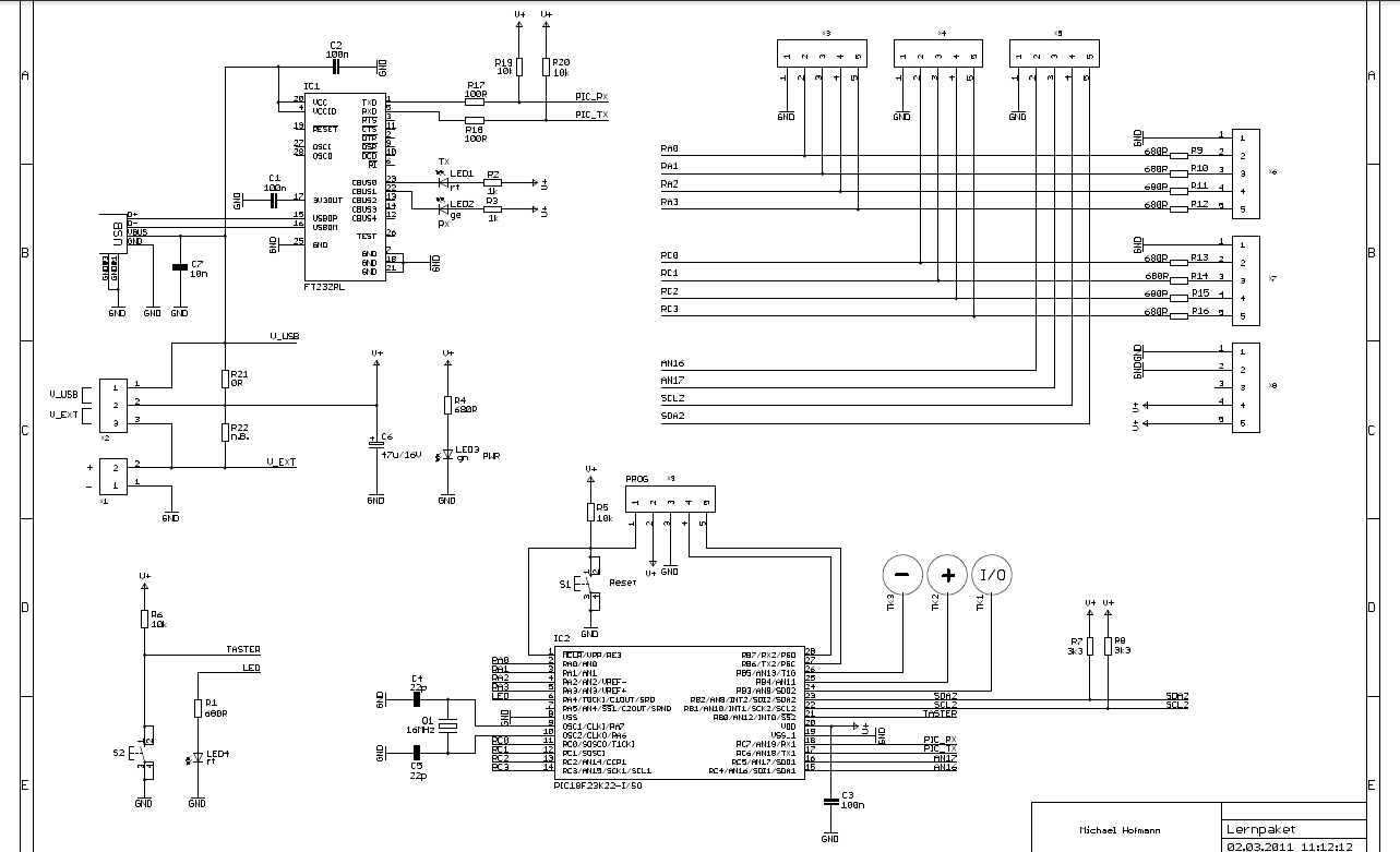 Hallo ich bin neu hier und hoffe sehr, dass ihr mir helfen könnt. Ich bin kurz vorm verzweifeln. Ein Kollege von mir hat sich so ein doofes Franzis Lernpaket PIC-Mikrocontroller gekauft und nun tut es nicht. Nach einigen Grundlagen kommt es im begleitbuch dazu die Hardware mit dem PC zu verbinden. Auf der Platine befindet sich der Mikrocontroller und ein FTDI FT232RL chip der angeblich USB to USART machen soll. Im Buch steht nun mann soll die Platine mit dem PC verbinden und LED's werden blinken/ aufleucten. Dann habe ich das , per USB kabel, getan aber auf dem Board hat sich nichts getan. Keine LED die blinkt am PC kam auch keine Meldung. So als hàtte ich gar nicht eingesteckt. Im Anhang befindet sich das ganze schema. Vielleicht kann mir ja jemand sagen was ich falsch mache. Habs am USB 2.0 Port angeschlossen obwohl der PC über 3.0 verfügt.