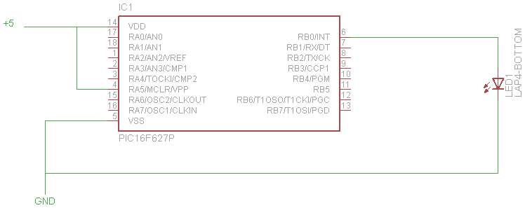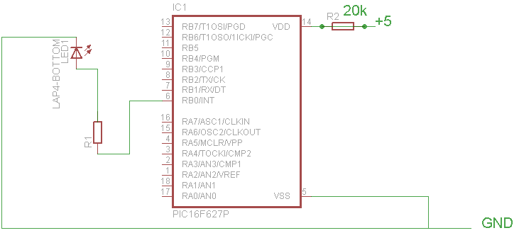 Alles klar, ein bisschen umständlich mit AVR als Editor, aber zeugt von Kreativität ;-) zum Schaltplan: 1) Wenn RB0 auf Highpegel +5V schaltet fliesst durch Deine LED der maximale Strom, den der Pin RB0 liefern kann. Wenn Du nicht so die LED schlachtest (jeder Pin liefert 25mA), dann aber sicherlich irgendwann den Port RB0 -> da sollte ein Vorwiderstand rein. 2) Der nMCLR Pin wird beim High Voltage Programming (siehe Datenblatt Seite 114) benutzt, daher darfst Du den PIN nicht hart (ohne Widerstand) an die Versorgung legen. Mit 20K-50K bist Du auf der sicheren Seite. Eventuell wird auch Low Voltage programmiert, dann braucht man den nMCLR Pin nicht für die Programmierung, kann also direkt an VDD gehängt werden. Zur Sicherherit solltest Du aber ein Pullup Widerstand nutzen.