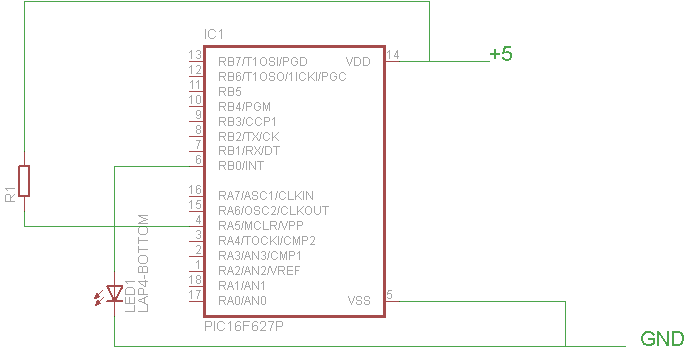 nicht ganz - VDD (Pin14) direkt an +5V - VSS (Pin5) direkt auf GND (ist ok) - LED mit R1 an RB0 (Pin6) (ist ok) - nMCLR (Pin4) mit 20kOhm an +5V legen (PIC aus dem Reset holen) Diese ist beim PIC16F627A die minimale Beschaltung, damit eine LED programmiert werden kann. Im Programm oder bei der Programmierung noch darauf achten, das der interne 4MHz Oszillator enabled ist.