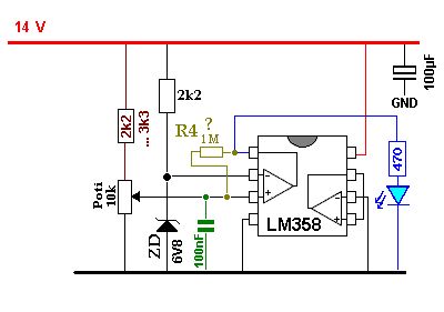 Hi, Kann mir bitte jemand sagen wie man hier die Hysterese berechnet? Mit dem Poti wird auf 13,9V eingestellt, dann leuchtet die LED. Das klappt. Wie rechnet man sich dann aus wie gross der R4 sein muss damit die Schaltung wieder kippt wenn 0,2V weniger sind? Soll heissen die LED soll bei 13,7V wieder ausgehen. Wie rechnen? lg Triti