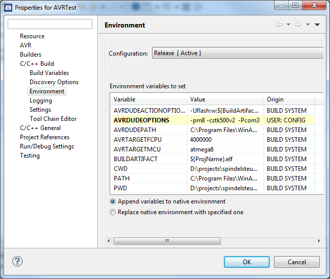 Hi, da ich nun auch mit STM32 µC arbeiten werde und dazu das Atollic TrueStudio Lite verwende wollte ich mir auch die AVR-Toolchain in Atollic einrichten, damit ich alle µC aus der selben Entwicklungsumgebung programmieren kann. Das Complilieren der Programme funktioniert mittlerweile auch. Das Flashen will aber noch nicht klappen. Ich bekome immer die im Anhang zu sehende Fehlermeldung. Der Programmer wird anscheinend auf com1 gesucht obwohl er an com3 hängt. Daher habe ich in den Properties versucht die Einstellungen von AVRdude zu verändern (siehe Anhang). Dies hat allerdings keine Wirkung gezeigt. Verwendet jemend von euch bereits erfolgreich AVRdude in Eclips/TrueStudio zum flashen seiner 8bit-AVR, bzw. weiß jemand vielleicht wie ich die Port-Einstllungen von AVRdude dort verändern kann? lg much PS: Der Programmer an sich funktioniert sicher. Aus der Console lässt sich der atmega problemlos flashen.