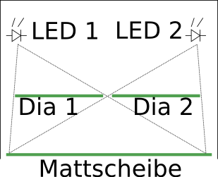eine matt/transparente Fläche, auf die von hinten z.B. durch ein Dia und eine LED ein Bild projiziert wird? Mit 2 Dias und 2 wechselweise geschalteten Lichtquellen könnte man das dann realisieren, wenn man es so ausrichtet, daß das Bild jeweils auf die Fläche fällt..