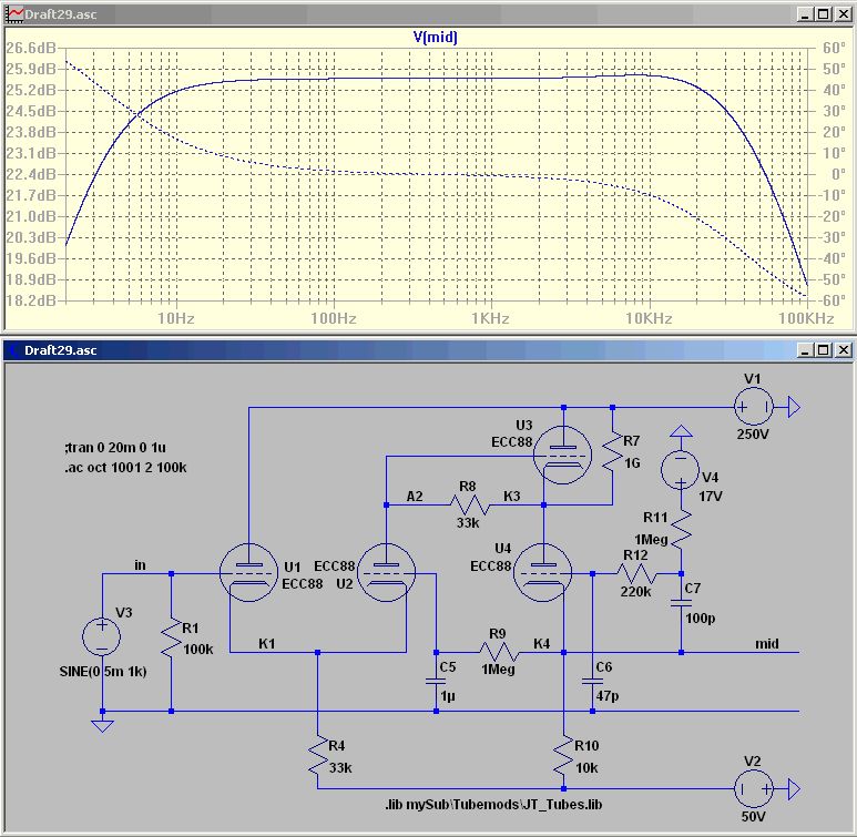Hallo Darius Wider besseren Wissens bezüglich der unzulänglichen Spice-Röhrenmodelle ... konnte ich es nicht lassen. Bis zur Hälfte ist die Schaltung bisher simuliert. Erst mal als linearer Vorverstärker. Die Linearität ist wirklich hervorragend, von 10Hz bis 20kHz < 1dB und zwischen 20Hz und 10kHz gibt es nur eine minimale Phasendrehung. Das ist der DC-Kopplung zu verdanken. Die erste Harmonische liegt bei -70dB. Außer den beiden Pufferröhren am Ausgang ist die zweite Hälfte ja fast identisch aufgebaut, deshalb sehe ich keinen Grund, warum das nicht auch funktionieren sollte. Vorsichtige Aussage: Wenn es in der Simulation funktioniert, dann vermutlich in der Realität noch besser. Ich könnte mir durchaus vorstellen, daß diese Technik bei High-End Röhrenfreaks Anklang findet. Das schwächste Glied in der Kette werden leider nach wie vor Ausgangsübertrager und die Lautsprecher bleiben. Gruß, Bernd