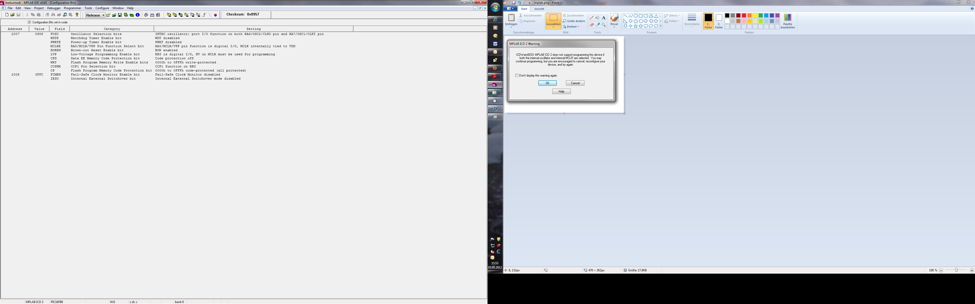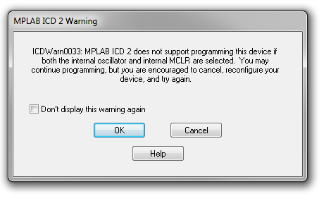 Hallo! Ich darf eine alte software laden, die in Assembler verfasst wurde. Dafür steht mir MPLAB zur verfügung. Builden ist kein Problem, beim Download erscheint aber folgende Meldung: Im Anhang! Ich kann aber weder der internal clock nnoch den MCLR ausschalten. Soll ich einfach auf external clock wechsel? Danke und Gruss! M.B.