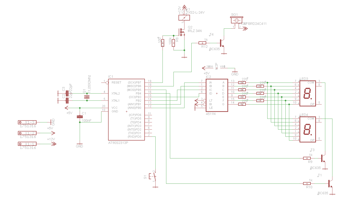 Hallo, könnt ihr bitte mal eine Blick auf die Schaltung + Code werfen und Verbesserungsvorschläge machen? (Siehe Anhang) Es ist mein 1. Projekt (Tastenentprellung wird noch hinzugefügt). Die Schaltung wurde bereits erfolgreich auf einem Steckbrett getestet. Funktionsbeschreibung: Bei Betätigung des Tasters wird ein Schütz über den MOSFET eingeschaltet (12V DC mit integrierter Freilaufdiode). Von x Sekunden wird herunter gezählt und die verbleibenden Minuten auf 2x 7-Segmentanzeigen angezeigt. Die Segmente werden über einen BCD-Treiberbaustein versorgt und gemultiplext. X Sekunden vor Ablauf wird ein Summer betätigt. Schonmal Danke für eure Vorschläge.
