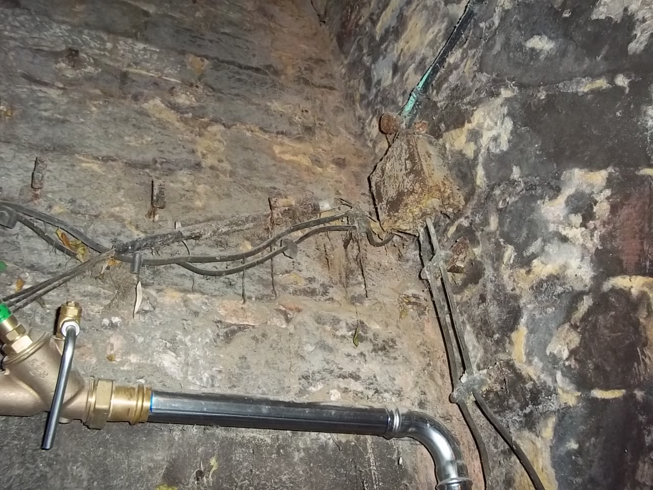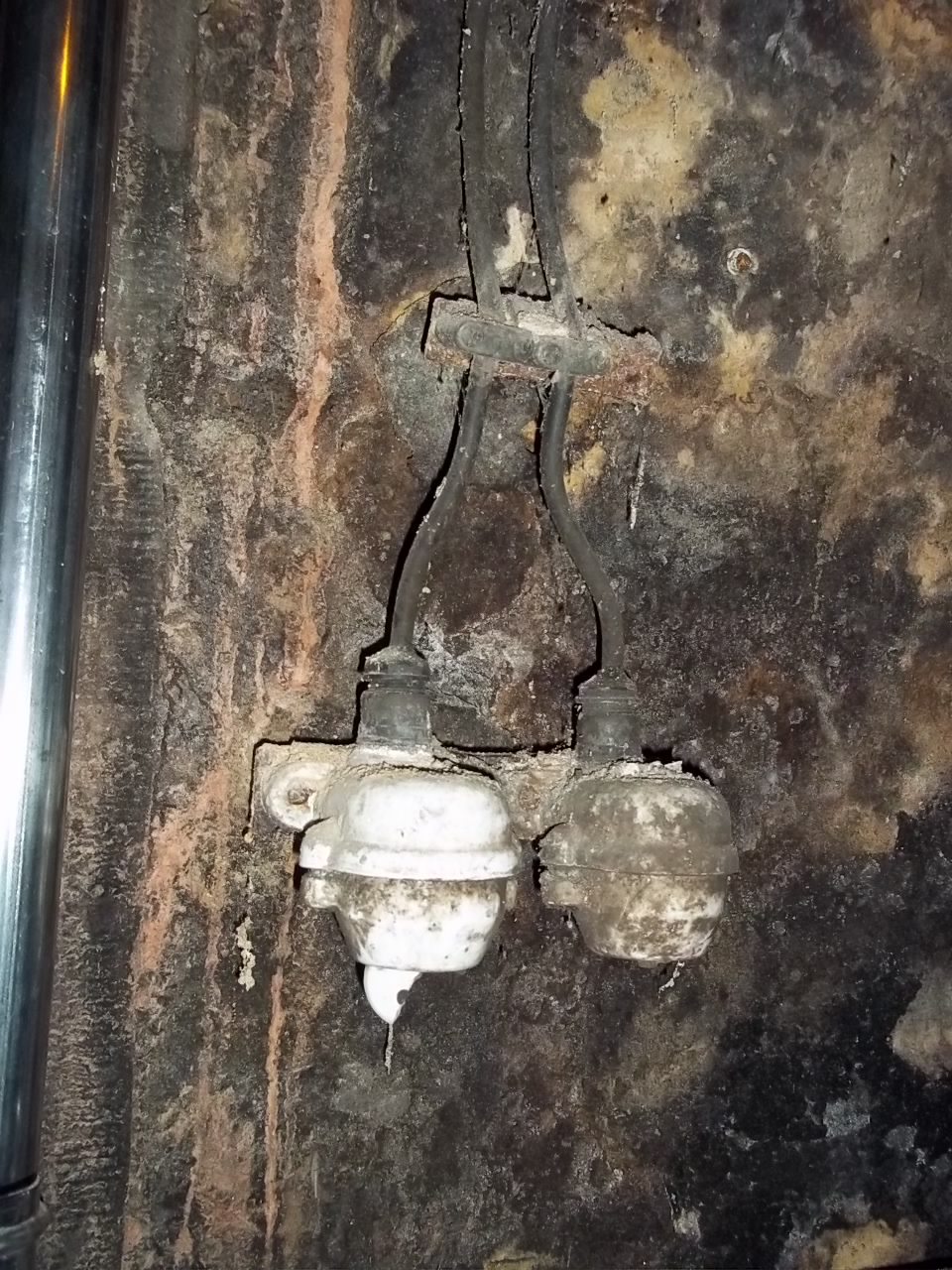 Nur zur Info: Das Bild 011 am Anfang zeigt die Schalter, mit denen die Raumbeleuchtung angeschaltet wird. Da ein Porzellanknebel abgebrochen ist, nimmt man halt eine Kombizange Gleichzeitig stehen 3 cm Wasser auf dem Fußboden. " Grusel"