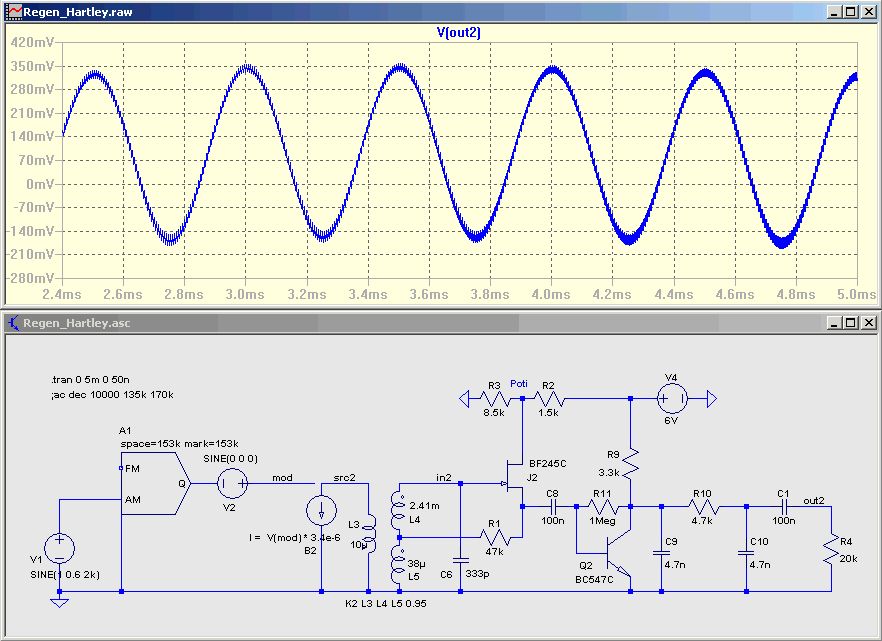 > bei welcher unteren betriebsspannung ist denn schluss mit RK? In der Simulation bei 5Volt, das Original läuft mit ca. 4Volt > der R1 ist vermutlich das, was oben gefehlt hat HF und DC-Spannung fallen jetzt am gleichen Arbeitswiderstand ab. Es wird kein Signal durch einen weiteren Widerstand am Drain verschenkt. Durch den hohen Widerstand muß die HF am Source größer werden, um die Rückkopplung aufrecht zu erhalten. Beim stärksten Sender liegen mit Rückkopplung am Abend ca. 200mVss an. Der Demodulator verstärkt natürlich noch zusätzlich. Bei einer kleineren Ferritantenne kommt immer noch die Hälfte raus, was auch für portablen Betrieb reichen sollte. @mitleser > Funktioniert einwandfrei selbst mit nur 1m Draht als Antenne. Bei welcher Frequenz?