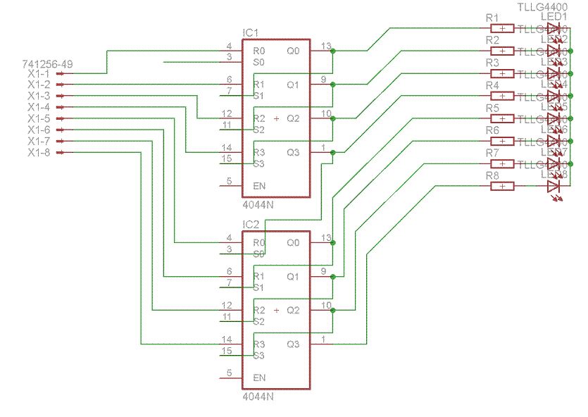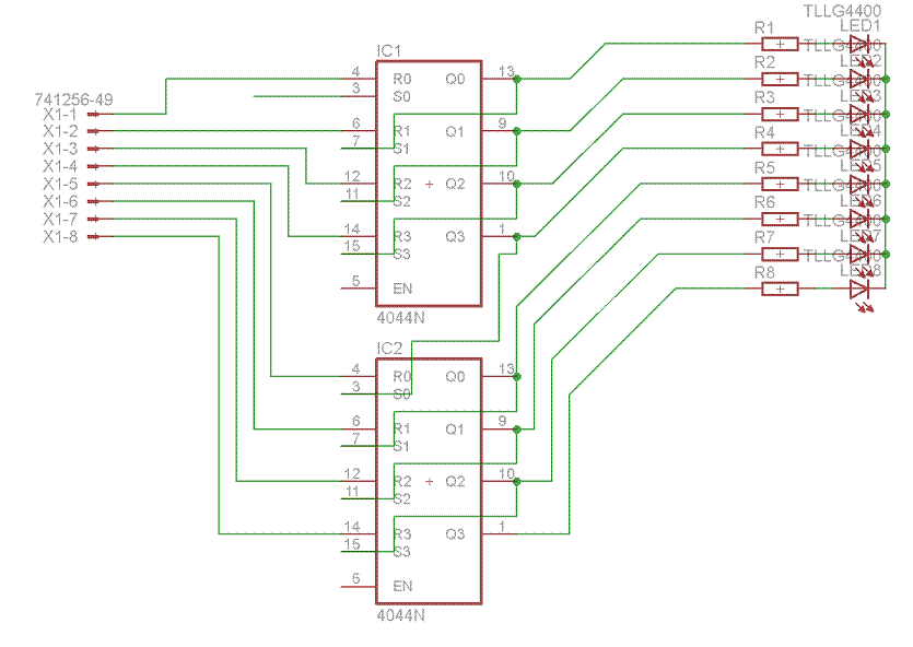 Hi Leute, im Anhang ein Plan, der folgenden Effekt an den LEDs verwirklichen soll. Der Stecker symbolisiert ein 8-Kanal-Lauflicht, das von der 8 zur 1 läuft. Pin 3 des ersten 4044 wird zunächst manuell über Schalter mit 12 V versorgt. Ein Schriftzug soll so dargestellt werden, dass die Buchstaben (hier die LEDs) von hinten nach vorne durchlaufen werden und der erste beleuchtet bleibt. Beim zweiten Durchlauf des LL bleibt der zweite stehen und so weiter, bis alle 8 Buchstaben leuchten. Optional soll der Schriftzug in der gleichen Reihenfolge wieder gelöscht werden. Bleibt Pin 3 des ersten IC ohne 12 V, passiert erstmal gar nichts. Bekommt er 12 V, wird FlipFlop1 gesetzt und bringt die erste LED zum leuchten. Gleichzeitig versorgt er Pin 7 mit 12V, so dass auch dieses FlipFlop beim nächsten Durchlauf des LL gesetzt wird und die nächste LED zum leuchten bringt und so weiter. Problem ist, dass nicht nur die nächste LED, sondern gleich zwei oder drei LEDs dahinter angehen. Vielleicht mit Kondensatoren die "S"-Eingänge entprellen? Läuft das erst mal gut, soll die Schrift ja genauso wieder gelöscht werden. Hat jemand eine Idee, wie es einfacher zu realisieren wäre und hat jemand ne Idee zum löschen der Schrift? Gruß Andi Ich habe bewusst auf Treiberstufen oder Betriebsspannung verzichtet, um das Problem so einfach wie möglich zu schildern.