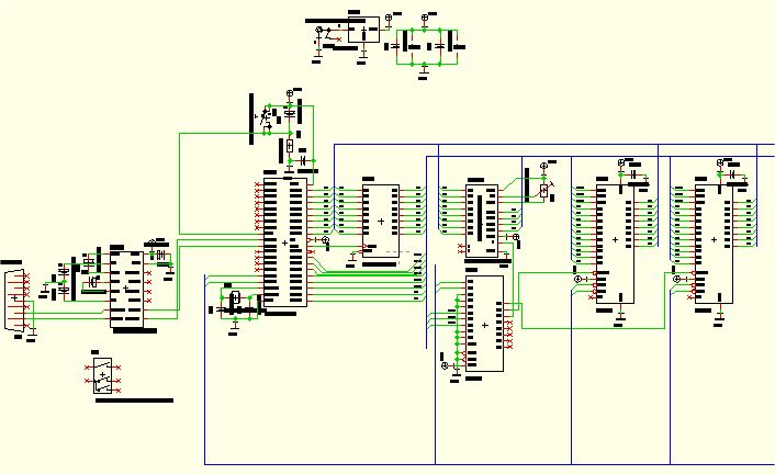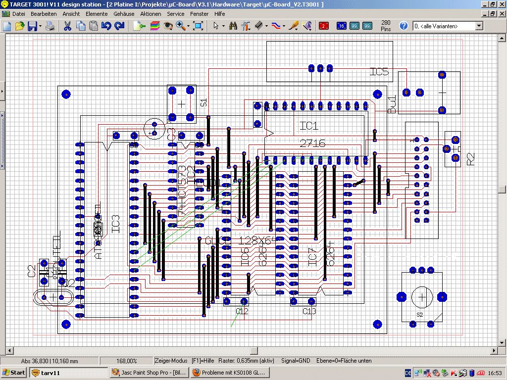 Guten Abend, ich baue mir momentan ein Controllerboard zusammen. Der Testaufbau auf Lochraster funktioniert einwandfrei. Auch die Ansteuerung des GLCD mit KS0108-Controller (128x64 von Pollin). Jetzt habe ich die Schaltung als Platine geätzt und die Ansteuerung des GLCD läuft nicht mehr korrekt. Egal was ich in den GLCD schreibe, es werden immer nur zwei Streifen pro Page ausgegeben. Ich suche mich schon seit Tagen nach dem Fehler dumm und dämlich, kann aber nichts wirklich finden. Setze ich den gleichen µC und das gleiche Display in den Testaufbau ein, funktioniert wieder alles. Aber einen Fehler auf der Platine kann ich auch nicht finden :( Habt ihr vielleicht ein paar Anregungen aus eventuell eigener Erfahrung was ich übersehen/falsch gemacht haben könnte? Ich habe die Platine schon auf vertauschte Anschlüsse, kalte Lötstellen, Ätzfehler und Kurzschlüsse untersucht, aber nichts gefunden... Danke schonmal für eure Hinweise, MC