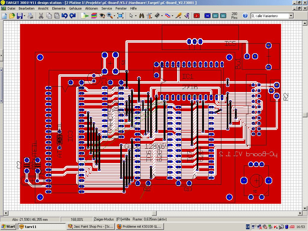 >Achja .. Gedult, um 0 fragen und um 8 wundern ... Sry, ich bin etwas hibbelig, weil mir der Fehler einfach nicht klar wird >Wenn ich das richtig verstehe sagst du das du nur die Hardware geändert >hast, aber nicht den Code. Genau, die Software ist absolut identisch. Setze ich das gleiche Display mit dem Gleichen µC in das Testbaord, funktioniert wieder alles. Kurzschlüsse habe ich keine gefunden, genausowenig Übertragungswiderstände. Die Leitungslängen sind im Vergleich zum Testboard erheblich geschrumpft, sollten also auch kein Problem machen. Bin momentan auf der Arbeit, schicke so bald wie möglich Schaltplan, Layout und Bilder. Versuche die Woche nochmal ein verändertes Testboard aufzubauen um zu prüfen, ob der Fehler systematisch auftaucht oder nicht.