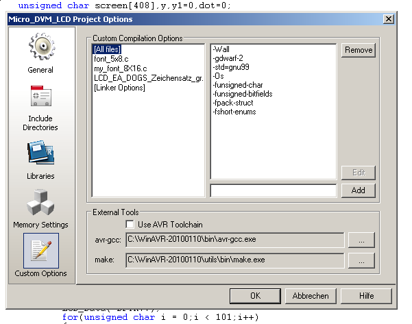 Hallo allerseits. Mein Problem ist, das ich keine Warnung mehr bekomme, wenn ich mehr Speicher deklariere als der µC überhaupt hat. Ich bekomme überhaupt keine Info mehr wieviel Data und Programm ich verwende. Die Vorgeschichte, ich habe über AVR Studio 4.16 AVR Studio 4.19 drüber installiert. Danach bekamm ich bei "build" immer die Fehlermeldung: avr-objcopy "Mein_projekt.elf" No such File Ich habe dann auf anraten hier im Forum dies gemacht: > When you create a GCC project now > you need to go to Project-Configuration Options then on the 5th tab > ("Custom options") set the path to avr-gcc to be /winavr/bin/avr-gcc.exe > and the path to "make" to be /winavr/utils/bin/make.exe and THEN you > should be able to build OK. Ich kann jetzt "build" machen und alles, nur das Problem mit der Speicher- ausnutzung. Ich habe voller Panik jetzt schon alles mögliche probiert, nur, um die Wahrheit zu sagen, ich verstehe nicht wie wie in so einer IDE wie AVR Studio das alles zusammenspielt.
