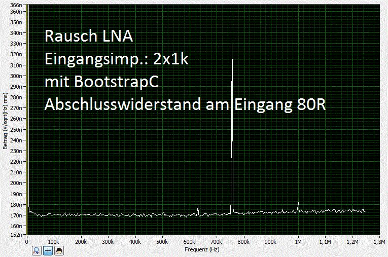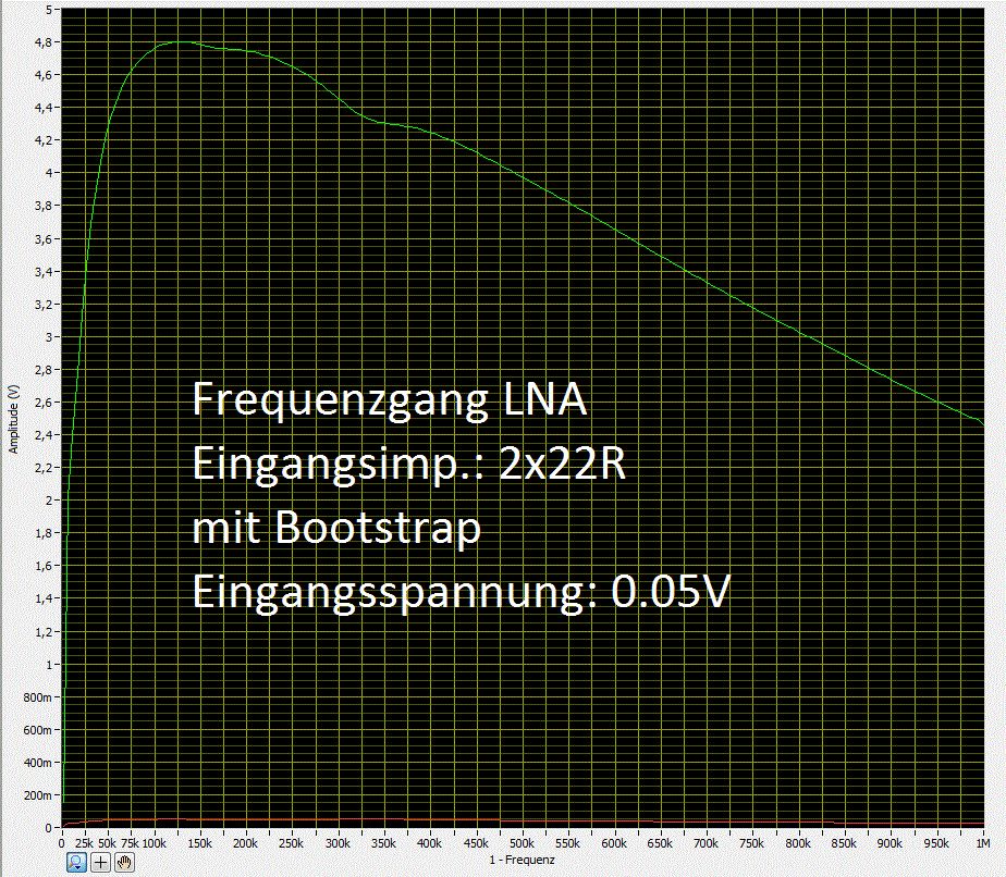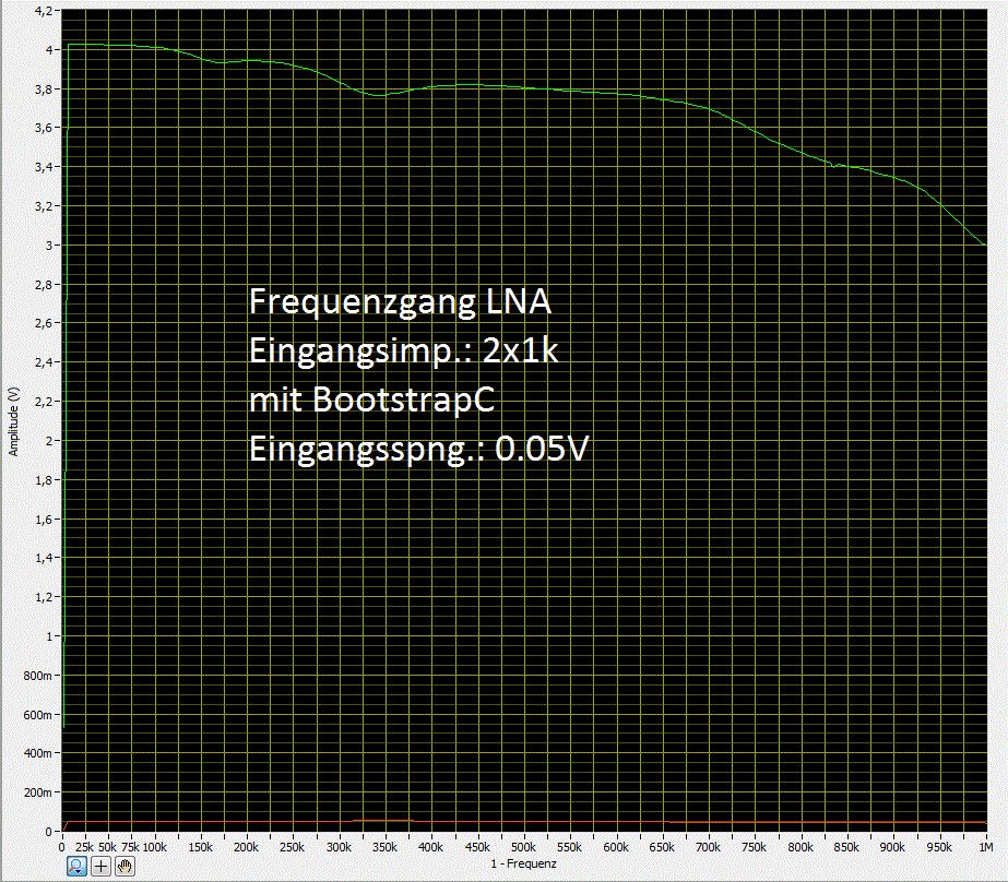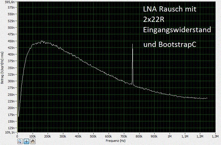 Vielen Dank erstmal für deine Hilfe. Angestrebter Frequenzbereich ist von 1kHz - ~1,x MHz. Ich glaube eine Sourcegegenkopplung gegen Temperaturdrift hatte mein Vorgänger, der sich mit der JFET-Version beschäftigt hatte, mit drin. Auf der Platine sind noch 2 Notchfilter drauf, die leider im Moment noch am Schwingen sind, und damit den LNA zum schwingen anregen (60MHz Â~10mV). Die Filter sind nicht direkt verbunden (keine Verbindung zwischen Ausgang LNA und Eingang Filter) und werden über eine seperate Versorgung mit gemeinsamer Massefläche gespeist. Vielleicht werden die 60MHz auch über die Masse oder anders eingekoppelt und der LNA schwingt nicht selber. Wenn ich nur den LNA versorge also die Filter nicht schwingen können, schwingt auch nix im LNA. Wenn die Filter dann mal vernünftig laufen, sollte es also keine Probleme geben. Trotzdem hätte ich die Schaltung gerne so stabil wie möglich. Masseflächen sternförmig aufbauen würde mir dazu noch einfallen. Gibt es sonst noch ein paar beruhigende/stabilisierende Tricks? Das der Bootstrapkondensator das Rauschen verschlechtert, könnte daran liegen, dass Rauschen vom Ausgang wieder auf den Eingang geführt wird. Was sagst du dazu? So ließe sich die Hochpasscharakteristik (0-200kHz) erklären.