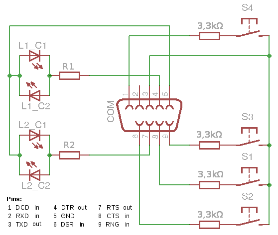 Ich möchte gern 4 Taster (simples Polling) und 2 Leds am COM-Port eines PCs betreiben. Die Programmierung mittels ioctl wird ja unter ... http://www.mikrocontroller.net/articles/Ports_benutzen_(GCC)#Die_Pinebene ... gut erklärt. Hinsichtlich des Schaltplans (Entwurf siehe Bild, Sicht auf Lötpins der D-Sub-Buchse) hab ich aber noch Unklarheiten. Ich las zwar, dass der COM-Port kurzschlussfest sein soll, denke aber, ein paar Widerstände schaden nicht: Jeder Taster bekommt einen Widerstand, um ggf. auch die Ströme zwischen den Eingängen bei mehreren gedrückten Tastern zu begrenzen. Für die 2 Leds (Duo-Leds mit 2 Pins) wird je ein Vorwiderstand (12V-Uf)/If verwendet. 2 Fragen: Kann man bei unterschiedlichen Leds (Uf und If) einfach jeweils deren 12V-Vorwiderstand verwenden, selbst wenn jene LEDs (und Widerstände) 'teilweise' in einer Reihe betrieben werden? (Knoten- u. Maschenregel) Hab ich vll. ein Problem übersehen?
