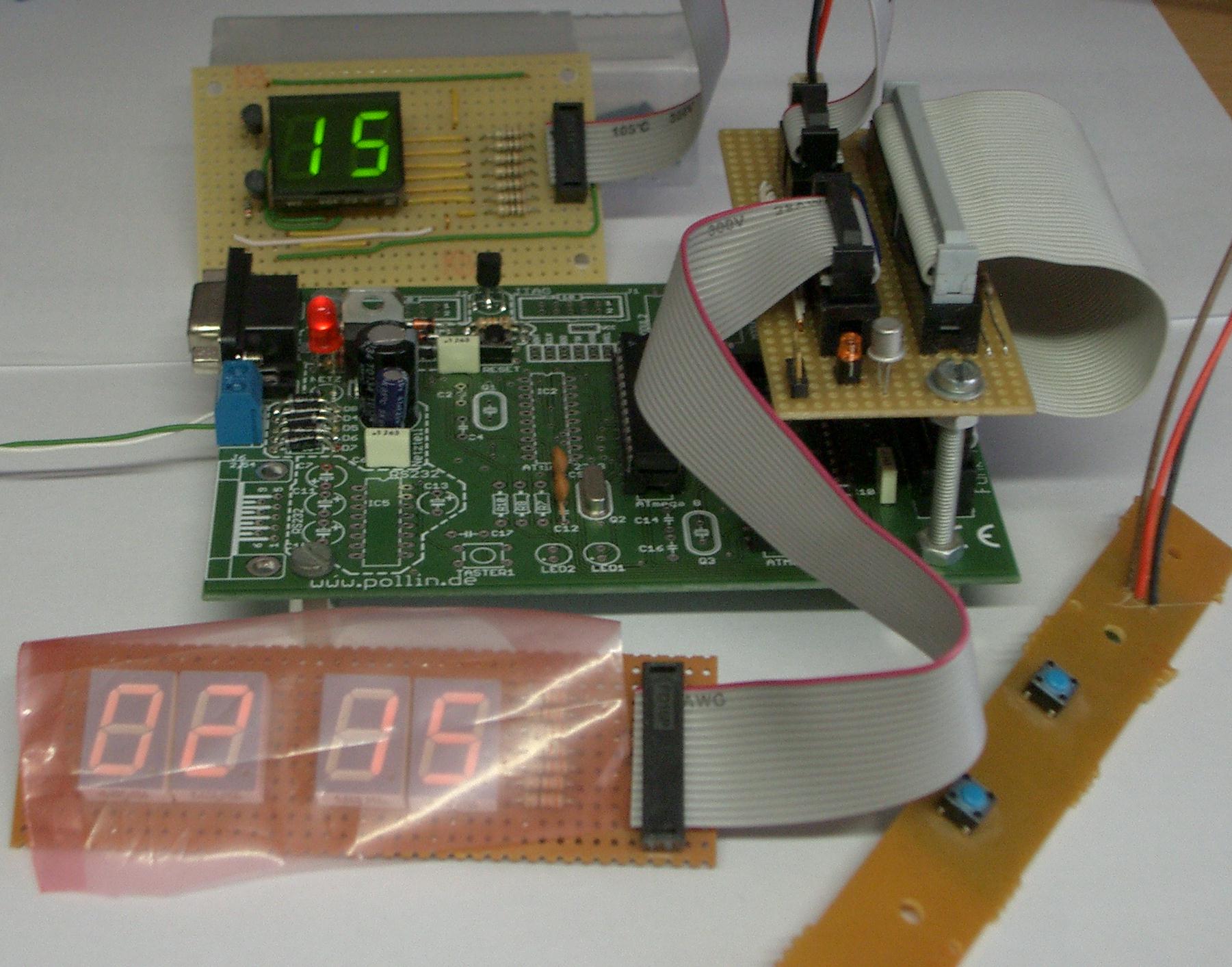 Hi, ich baue gerade für unseren Fussballverein sowas Ähnliches. Als Steuerteil verwende ich ein Pollin Funk-Entwicklungs- board. Minimalbestückt. Im Moment zählt ein Atmega 8, kann aber auf dem Board auf Atmega 32 geändert und mit einem Funkmodul bestückt werden. Grüne 7 Segmentanzeige = Menüführung 1 = Menü 5min (z.B.) S wie Start. Uhr zählt. Dann gibt es noch: H wie Halt,Stoppt Timer und U wie Vorbereitung. Zeigt Startzeit an, zB 2. Halbzeit dann ab 45 min. Rote 7 Segmentanzeigen simmuliert die Großanzeige. Das ganze wird mit 2 Tasten gesteuert. Menue; 1; 2; usw. Timer; U;S;H das Steuerboard ist nur die halbe Miete. In der Anzeigeeinheit, bei mir 4 x 12" Siebensegmentanzeigen, befindet sich 2 Netzteile (Leistung; Steuerteil) Relais für Hupe(2sec vor Spielende 2sec. Hupton, dann sollten die Zuschauer wach sein.) und die Leistungsteilplatinen mit Mosfets. Wenn Du 0 Ahnung hast, kaum möglich. Materialkosten 200- 500 Euro ohne Anzeigegehäuse. Wigbert