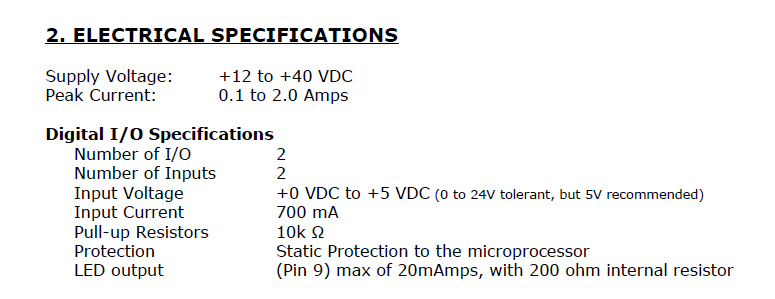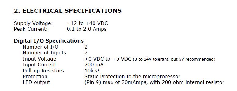 Hallo, ich habe eine Frage zum digital Eingang eines Microcontrollers. Wir verwenden einen bestimmten Controller zur Ansteuerung eines kleinen Schrittmotors. Nun wollen wir den Controller mit einer Gabellichtschranke verbinden und ihn stoppen, sobald ein Gegenstand diese Gabellichtschranke passiert. Das Problem liegt jetzt in der Verbindung von Controller und Lichtschranke. Wir verwenden den folgenden Controller: http://www.rmsmotion.com/ecart/part_detail.aspx?catID=2&partID=44 Auf der Webseite ist auch das Manual zu finden. Ich habe aber von der relevanten Stelle einen Screenshot gemacht und hochgeladen. Ich wollte jetzt gerne fragen, für welches Spannungsintervall am Controller eine logische 1 und für welches Spannungsintervall eine logische 0 anliegt. Auf dem Screenshot steht, dass die "Input Voltage" 0 bis 5 Volt beträgt. Heißt das jetzt, dass erst ab einer Spannung von etwa 5 Volt eine logische 1 am Controller anliegt? Ich habe die Gabellichtschranke an den Controller angeschlossen und Folgendes gemessen: Wenn die Lichtschranke durchbrochen ist, liegt zwischen dem Pluspol und dem µC-Eingang eine Spannung von etwa 0.03 Volt an. Wenn sie nicht durchbrochen ist, liegt eine Spannung von etwa 0,5 Volt an. Ich nehme mal an, das ist zu gering, oder? Anmerkung: Mit dem Pluspol meine ich den Ausgang des µC, der die Gabellichtschranke mit Spannung versorgt. Diese Spannung beträgt laut Manual 5 Volt bei 20 mA. Es wäre sehr schön, wenn mir jemand einen Tipp geben könnte. Vielen Dank im Voraus! :-)