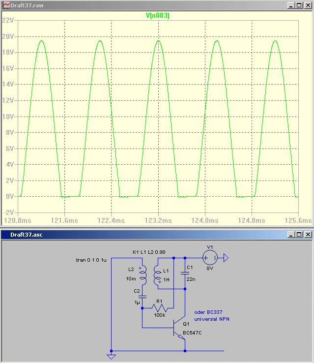 Wie schon angefuehrt, ist die Schaltung aus deinem Link Schrott. So sieht ein vernuenftiger Meissner-Oszillator aus (siehe Bild zu Meißner-Oszillator mit Bipolartransistor): http://de.wikipedia.org/wiki/Mei%C3%9Fner-Schaltung In meiner Lehrzeit hatten wir die Meissner-Schaltung aehnlich nach der Schaltung im Wikipedia-Artikel aufgebaut und einen Schalenkern verwendet.