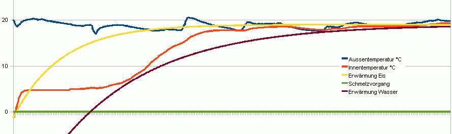 Die theoretische Betrachtung war(ist): erste Phase:Eis wird erwärmt bis genau 0° danach schlagartig (natürlich nicht in RL) zweite Phase:Energie wird nur zur Phasenumwandlung verwendet bis das Eis komplett geschmolzen ist und schlagartig nur in der dritten Phase:das Wasser erwärmt wird. Langsam habe ich den Verdacht das die Werte die ganze Zeit richtig waren und mir die Psycholgie einen Streich gespielt hat. Ich hab mal für Interessierte eine Grafik für 1Kg über 25 Stunden angehängt. Trotz kleinerer Missverständ vielen Dank für die Bemühungen
