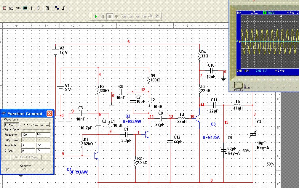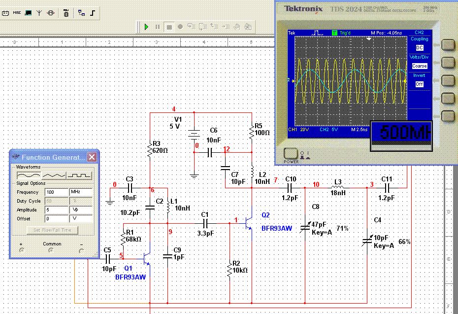 Hallo, Ich habe diese (100MHz Quarzoszillator) zu 5X Vervielfacher Schaltung mit Multisim10 entworfen aber wie man sieht die 500MHz Sinussgnal ist leider nicht im Form. Ich wäre dankbar wenn jemand mir ein Tip gibt woran das liegen kann und wie ich die schaltung optimieren kann. Ich freue mich auch auf jeden Hinweis und Kritik zur ganzen Vervielfacher und Verstärker Schaltung, denn ich will wissen ob das im Realität funktionieren würde bevor ich alles SMD um sonst löte. Meine mathematische Kenntnisse ist sehr bescheiden daher habe ich alles m.o.w durch potis, trimkondis und drehkondensatoren etc. eingestellt. Die Ein/Ausgangwiderständen den verschiedenen Stufen habe ich leider per zufall. Obwohl ich etwas info u.a von hier http://hem.passagen.se/communication/pa313.html gesammelt habe, aber meine Kenntnis ist immer noch nicht so reif das ich mehr als das per Rechnen und kalkulieren erreichen kann. Danke im Voraus avrfreak