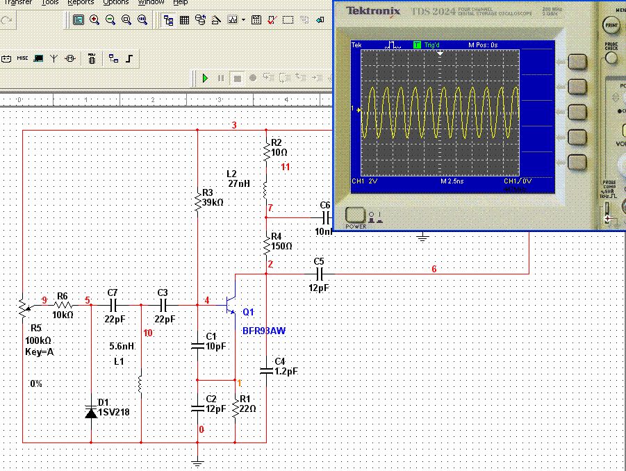 Matthias Sch. schrieb: > avrfreak12 schrieb: >> Die schaltung im Angang habe ich auch nachgemacht, allerdings konnte ich >> nicht es schaffen mehr als 250 MHz zu erzeugen > > Es ist auch extrem wichtig, alle Anschlussdrähte so kurz wie möglich zu > machen und den Aufbau generell so kompakt wie möglich zu halten. Ich denke ich habe auch mit den beiden kondensatorn rum gespielt aber die Schaltung habe ich aufgegeben! Ich habe später einen Nachfolger gebaut der mir um 400 MHz geliefert hat aber ich habe Probleme mit den Puffer. An einem MSA0886 zB als puffer anzuschliesssen wäre nicht gehen weil das VCO Signal ist zu schwach ihn zu berteiben. Das simulierte VCO im Anhang (noch nicht verwirklicht) ist das aktuellste Versuch aber mir stört die enebener Sinusform wie man im Bild sieht, ist nicht in ordung. Meine Frage ist woran liegt dass? Um es zu Verbessern habe ich versucht durch den Arbeitspunkt einstellung, die LC Werte.. Aber ich habe kein Erfolg gehabt. Ich werde auf alle fälle ab diese VCO mit rein SMD Teile arbeiten.