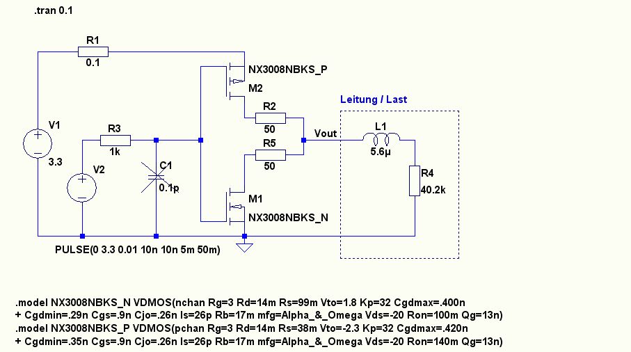 Hallo Zusammen, ich habe ein Problem mit einer Schaltung von mir. Im Grunde möchte ich einen Push Pull Ausgang entwerfen. Dies ist soweit auch kein problem (gedanklich). Leider habe ich in der Simulation genau das festgestellt was ich auch in bösen Träumen schon bildlich vor mir sah. Es fließt zuviel Strom! Anbei sind die Schaltung und die PWM-Spannung (Blau) sowie die Spannungs direkt an den MOSFets (Rot). Das Abbild des Stroms versteckt sich unter dem namen Simulation. Mir ist klar das die Stromwerte nicht mit der Realität zu vereinbaren sind. Jedoch ist schlecht das es überhaupt zu einem Strom kommt. Falls jemand Interesse hat ... die LT-Spice Datei ist auch angehängt. Meine eigentliche Frage... : Ist diese Schalter überhaupt so wie sie da steht nutzbar?! Gibt es eine Bessere lösung? Danke :) P.s.: der verwendetet MOS ist in der Schematic zu finden. P.s.s.: Ihr braucht zum simulieren meine Lib mit dem Bauteil drin. ... ist auch angehängt