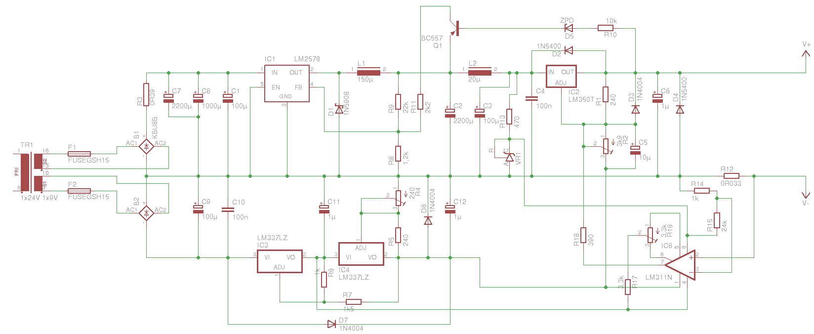 Hallo Leute, da der Selbstbau von Netzteilen meiner Meinung nach zum Basteln dazugehört, habe ich mir eine Schaltung überlegt, die mit vorhandenen Teilen bzw. günstigen Komponenten realisierbar ist. Das Netzteil soll nicht allzu viel Rippel haben und sich für verschiedene Bereiche zu Hause und im Bastellabor eignen. Ich hatte an maximal 20V und maximal 3A gedacht. Beim Basteln verwenden wir hier meistens alte Gossen-Konstanter(15V 1,5A). Bei denen kann man die Strombegrenzung in sechs Stufen schalten, an so etwas hatte ich bei dem Netzteil auch gedacht. Ich habe mal zwei Versionen dazu gezeichnet. Da ich nicht immer alle Teile so in der Eagle-Bibliothek gefunden habe, habe ich versucht vergleichbare Bauteile zu nehmen, z.B. wird D1 wohl eine MBR340 werden. Was meint ihr zu der Schaltung, kann das so gehen? Besonders skeptisch bin ich bei dem Teil mit Q1, D5 und R10. Meint ihr die Strombegrenzung könnte so funktionieren? Wir haben noch Unmengen vom LM211 Komparator, daher wollte ich dort mal einen verbauen. Als ich mit der Schaltung angefangen habe, bin ich hauptsächlich nach den Datenblättern gegangen. Zwischendurch habe ich dann folgende Schaltung gefunden, bei der beispielsweise der Teil mit Q1, D5 und R10 etwas anders gelöst wurde. http://mral.peu.net/data/PowerSupplies_attach/PowerSupply-w-Sw-PreReg-07.GIF Ich freue mich über Kritik, Links, Hinweise, ... Schöne Grüße Daniel P.S.: D5 soll eine Zehnerdiode mit ca. 3V sein. R12 soll umschaltbar sein (0,033; 0,051; 0,1; 0,22; 0,47; 1) Beim Trafo bin ich mir noch nicht ganz sicher. Es sollen einmal ca. 24V AC und 9V AC zur Verfügung stehen. Der 24V Trafo wird wohl ein "MZ8" mit ca. 120VA.