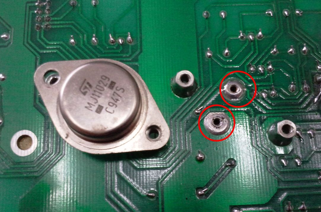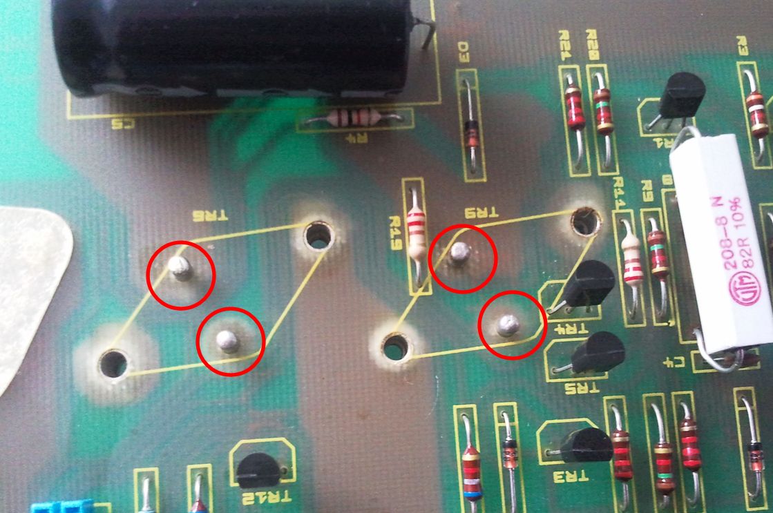 Vorzeitig? Das Gerät ist etwa 30 Jahre alt, und viel benutzt worden. Tatsächlich sind die Lastwiderstände R18 und R12 ziemlich angegriffen, also "verbrannt", ebenso die Leiterbahnen zu den Widerständen. Widertandswert passt noch, und die Leiterbahnen schienen auch noch intakt, aber ich hab vorsichtshalber die Leiterbahnen etwas verstärkt und neu Lackiert.