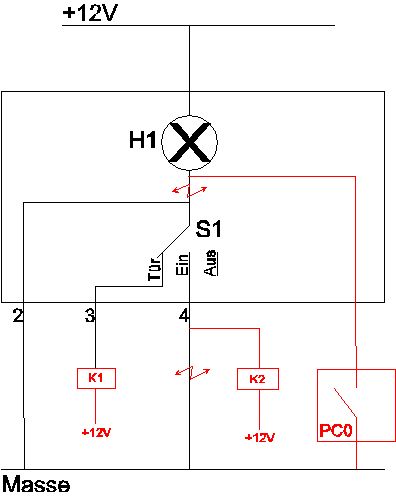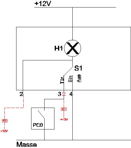 Im Prinzip ne Superlösung, wenn ich das mit der Analogwerterfassung könnte. Würde mich da sicherlich auch noch gerne einarbeiten, aber ich denke da gerade an den Fall, wenn z.B. das Licht über die PWM-Ansteuerung der KSQ ausgedimmt wird. Da wird der Spannungsabfall an der Diode doch auch irgendwann kleiner. Wäre da ein sicheres Auslesen noch gewährleistet? Habe auch nochmal n bissl nachgedacht und ein paar Änderungen in rot eingefügt (K1 würde nur anziehen, wenn der Schalter in Stellung "Tür" steht und PC0 angezogen ist). Allerdings ist mir auch bei dieser Änderung aufgefallen, daß sich die Schalterstellung "Aus" nur einwandfrei auslesen ließe, wenn PC0 eingeschaltet ist. Eigentlich gehört das ja schon nicht mehr ganz zur Aufgabenstellung, aber wenn sich die Schalterstellung "Aus" auch noch in jeder Konstellation auslesen ließe, dann wäre alles perfekt. Nochmal was zum Hintergrund der Aufgabe: Mir ist aufgefallen, daß unabhängig von der Schalterstellung ein Dimmvorgang der Leuchte durchgeführt wird. Das würde in Schalterstellung "Ein" dazu führen, daß die Leuchte ausdimmen könnte, obwohl sie eigentlich ständig eingeschaltet sein soll. Im Prinzip nicht schlimm, aber auch schön, wenn's besser ginge. Mit dem Auslesen der Schalterstellung hätte ich also die Möglichkeit, eventuell auftretende Dimmvorgänge direkt abzubrechen. Ein weiterer Punkt wäre: Wenn ich Schalterstellung "Aus" sicher auslesen könnte, hätte ich die Möglichkeit, eine Bedingung zu schaffen, um auch andere vom ATmega88 gesteuerte Funktionen auszuschalten.