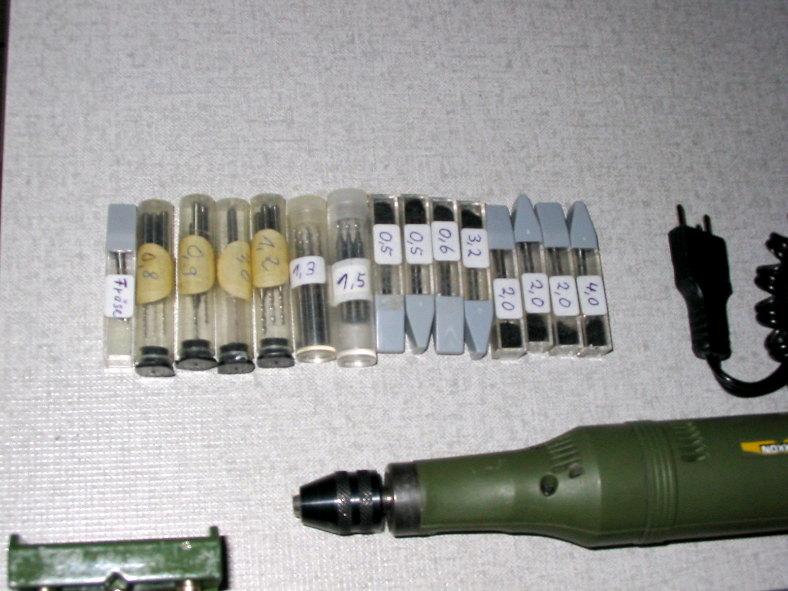 Verkaufe für 150,- EUR (inkl. Versandkosten) Kontakt: hb248 ät t minus online punkt de ------------------------------------ Wird nur als Komplett-Set abgegeben! ------------------------------------ 1 x Proxxon (MBS 140) Bohrständer 1 x Proxxon (50/E) Bohrschleifer 12V, regelbar 1 x Proxxon (MIS 1) Micro-Schrauber Links/Rechts 1 x Proxxon (NG 2/S) Netzgerät 12V 1 x Proxxon (MF 5) Mehrfachsteckdose für 12V 1 x Proxxon (MS 4) Maschinenschraubstock Hartmetallbohrer mit verstärktem Schaft: ---------------------------------------- 2 x 0,5 mm 1 x 0,6 mm 3 x 0,8 mm 3 x 0,9 mm 1 x 1,0 mm 3 x 1,2 mm 5 x 1,3 mm 3 x 1,5 mm 3 x 2,0 mm 1 x 3,2 mm 1 x 4,0 mm 1 x Hartmetallfräse ----------------------------------------