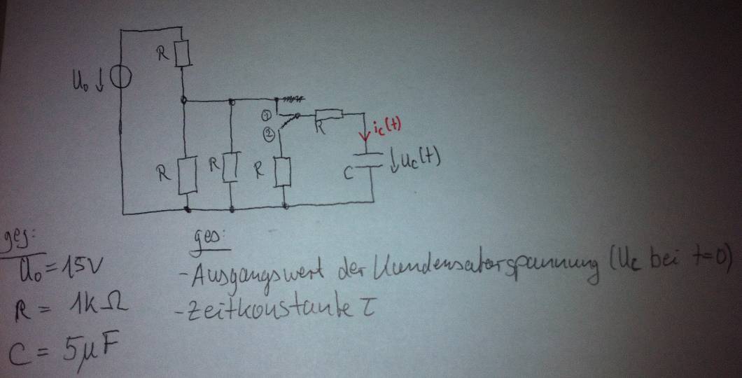Hallo klaus, Danke erstmal für deine antwort. In der aufgabe wird angenommen, dass der schalter hinreichend lang auf der ersten position war und somit voll geladen ist. Erst beim schalten auf position 2 fängt der kondensator an sich zu entladen. Ich bin jetzt zwar auch theoretisch etwas dahinter gestiegen, aber irgendwie kann ich Das problem nicht rechnerisch lösen. Gibt es eine bestimmte formel für einen spannungsteiler?