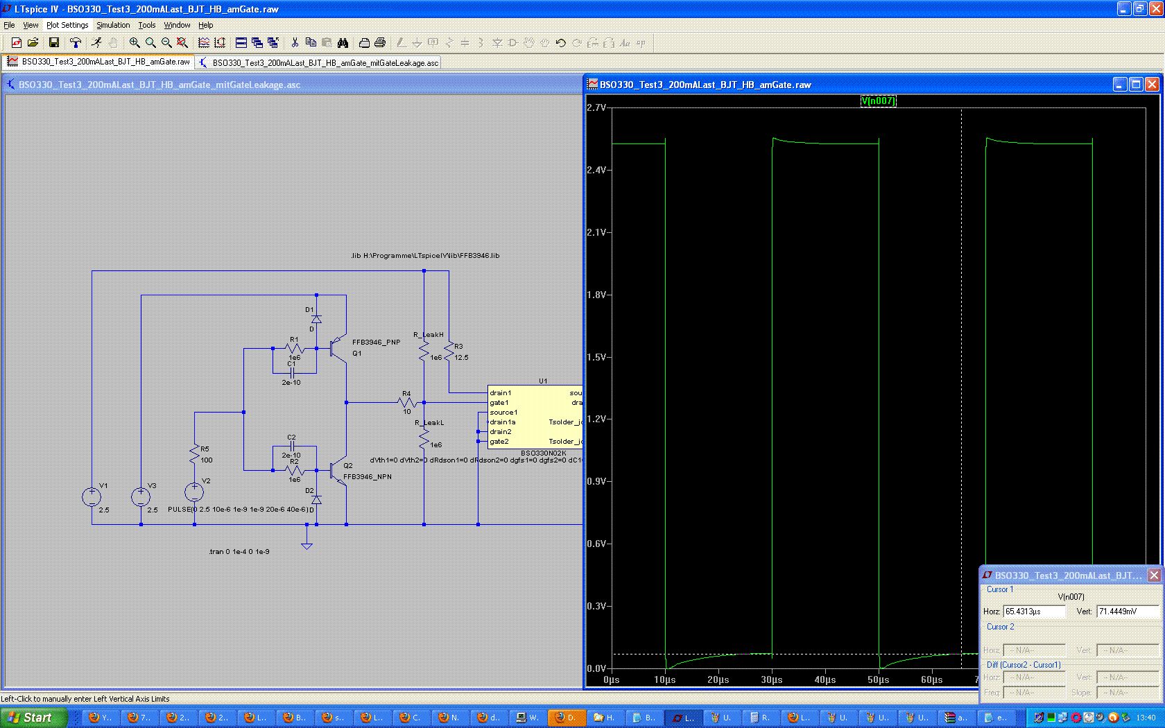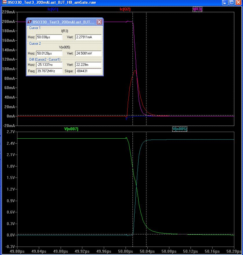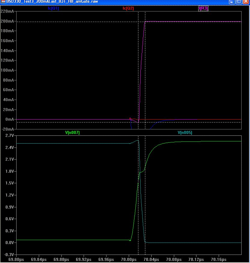 @Jonathan Strobl So, ich habe deine Schaltung mal etwas detailierter ausgearbeitet. Ich habe ein Modell des BSO330 bei Infineon bekommen (gelber Klotz). Die Kondensatoren habe ich auf 200pF reduzieren koennen, 100pF gehen auch noch aber da wirds dann knapp. Zusaetzlich habe ich noch 1M-Widerstaende parallel zu den "Basis-Kondensatoren" gemacht, damit man nicht auf die korrekte Ladungsspeicherung am MOSFET-Gate angewiesen ist, also gegen Leckstroeme gewappnet ist (ich weisz, eigentlich unnoetig (Paranoia)). Die Transistoren sind ein komplementaeres Paerchen von Fairchild die einigermaszen schnell sind. N007 ist das MOSFET-Gate N005 ist Drain Wie man sieht (temp_Schaltung.gif), bleiben durch die kuenstlich erzeugten Leckstroeme ~70mV gegen GND, deutlich weniger gegen Vcc. In dem gezeigten Fall ist es sogar so, dasz U_gate aufgrund irgendwelcher parasitaerer Induktivitaeten ueber 2.5V steigt und innerhalb der Zeit bis zum Umschaltvorgang garnichtmehr darunter faellt. Zuvor hatte ich mal 100K-Widerstaende als "Leckstromwiderstaende" eingesetzt, da kam ich dann ~10mV unter Vcc und ~100mV ueber GND. Diese Asymetrie finde ich etwas seltsam, denke aber das wird an der Charakteristik der Transistoren liegen. Der Einschaltvorgang dauert ca. 12ns, der Abschaltvorgang ~25ns; -wobei das etwas willkuerlich ist, da ich nicht die ueblichen 10%-90% genommen habe, sondern beim Einschalten den vollen Hub und beim Abschalten die Zeit bis der Strom 1% des Nennstromes erreicht hat. Allerdings braucht es (rechnerisch) ~155µW bei 31KHz Schaltfrequenz und 5V Vcc um die Kondis der Vorstufe umzuladen. 39µW bei Vcc=2.5V Was ich auch etwas seltsam finde ist der negative Basisstrom der sich an den Transistoren ergibt : z.B. beim Einschalten des BSO330. Der Eingang meiner invertierende Vorstufe wird dabei von Vcc auf GND geschaltet, d.h. der PNP (Q1) oeffnet und der NPN (Q2) schlieszt. Dabei faellt die Spannung an der Basis des NPN von ~+0.5V rapide auf ~-0.7V, zu sehen in "temp_seltsamerBasisstrom.gif" und "temp_seltsamerBasisstrom_timeCorr.gif". N008 ist uebrigens die Basis von Q2. Dabei flieszt ein Strom rueckwaerts aus der Basis dessen Maximum zeitlich mit der max. Flankensteilheit der (fallenden) Basisspannung korreliert. Soweit so gut, das ist erklaerbar mit der parasitaeren Kapazitaet der Basis gegen Kollektor und Emitter. Seltsam finde ich nur, dasz dadurch scheinbar auch der kleine Kollektor-Emitter-Stromflusz verursacht wird (rote Linie). Und nein, der kommt nicht (alleine) daher, dasz Q2 vor dem Umschalten noch etwas forward-biased ist (durch R2), denn ich hatte das ganze auch ohne R2 und R1 simuliert und es kam das selbe heraus.
