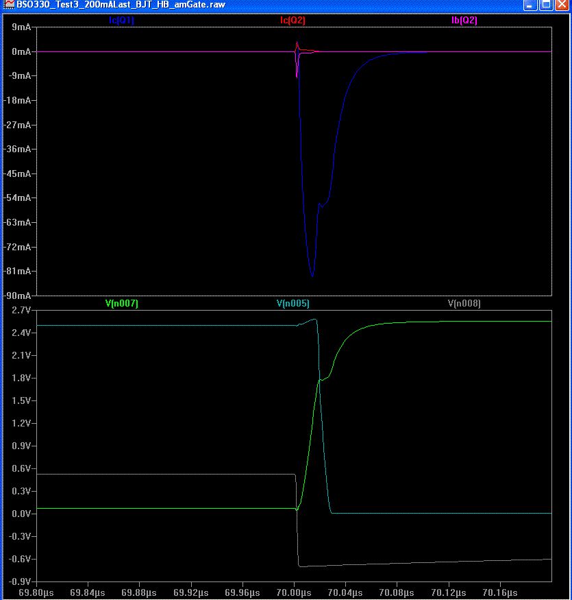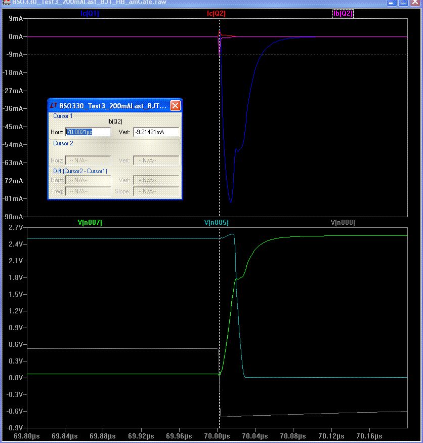UPDT.: ok, der Kollektorstrom kommt von der Kollektor-Basis-Kapazitaet in Verbindung mit der von ~0 auf ~2.5V steigenden Spannung am Kollektor, stimmts ?