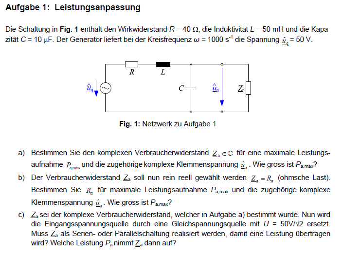 ich sehe ganz andere Fragestellung in der Aufgabe beschrieben als das was du oben schriebst :) R und L zusammengefasst -> Z1 Xc und Za sind parallel -> Z2 abs(Z1) = abs(Z2) angle(Z1) = -angle(Z2) gibt ein paar wilde Gleichungen ... dann ist eine Leistungsanpassung gegeben, in dem Sinne, dass in Za maximale Leistung verbraten wird b) und c) nicht gelesen