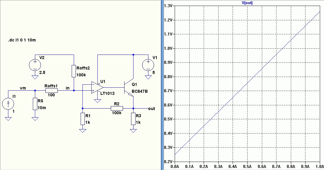 ArnoR schrieb: > Wo ist denn Knoten 006 Der ist am Punkt zwischen R1 und Q2, sozusagen der Messausgang für den niedrigen Strom. UR-Schmitt schrieb: > Bei einem Shunt von 0,01 Ohm hast du bei 70 mA noch eine Spannung von > 0,7mV. > Ein OP verstärkt auch kleine Spannungen aber damit dürftest du (ohne mir > jetzt das Datenblatt des OPs angeschaut zu haben) im Bereich der > Offsetspannung sein. Ich hab eben das Datenblatt angesehen und da steht eig was von max 150µV Offset, also sollte das eig vom OPV her funktionieren, oder liegt es daran, das ich keine negative Spannungsversorgung am OPV hab? Aber dafür hatte ich ja eig den Transistor am Ausgang vorgesehen, mh, komisch. MfG Dennis