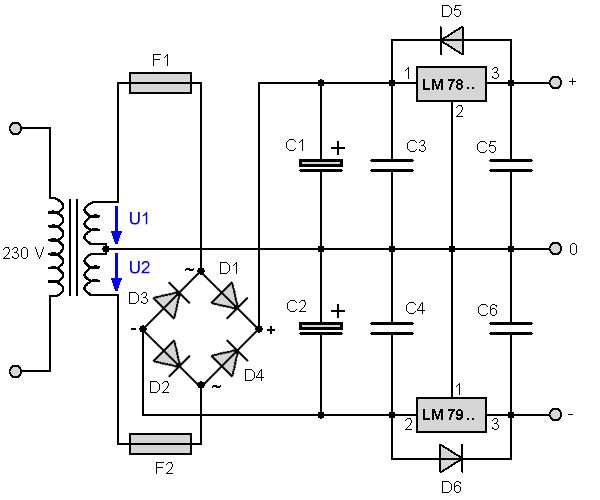 Allgemein kannst du dir merken, die Dioden im Gleichrichter zeigen immer auf den positiven Ausgang. Der gegenüberliege (zeigt also alles von weg) ist negativ. Die anderen beiden sollten klar sein. Ein Spannungsregler braucht niederohmige Kondensatoren für seine Stabilität. Sonst KÖNNTE dieser zu schwingen anfangen. Natürlich kann er auch mit ELKOs oder ganz ohne Kondensatoren funktionieren, muss aber nicht. Zudem kann sie dadurch störanfälliger werden und nur sporadisch nicht funktionieren. (Quelle: Beitrag "Re: 7805 Kondensatoren") Also 100nF vor und hinter die Regler. dann kannste alle anderen bis auf die 2200µF rausschmeißen. Und da du mit 100mA abgesichert hast (reicht das? Wirkt so wenig) kannst du die auch locker auf 470µF oder 1000µF verkleinern.