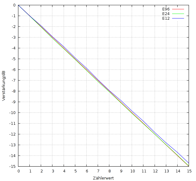 Zwischen E96 und E24 sieht man fast keinen Unterschied, aber auch E12 ist noch in Ordnung. Die Widerstände müssen auch nicht eng toleriert sein. ±5% sieht man im Ergebnis kaum und hört sie erst recht nicht. Die einzelnen Schritte müssen ja nicht exakt 1dB sein. Sie müssen nicht einmal gleichgroß sein. Grob ungefähr ist in Ordnung. Such dir eine der drei Alternativen aus :) Lothar Miller schrieb: > Eigentlich ist es absurd, Widerstände im Ohmbereich anzugeben, wenn > schon der Bahnwiderstand des Umschalters deutlich grösser ist... Der spielt hier keine Rolle, weil der Ausgang des Multiplexers zum hochohmigen Opamp-Eingang führt.