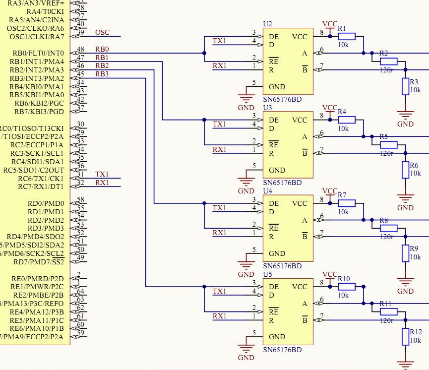 wieso er das sollte? nun, weil er dann die UART Einheit des Controllers verwenden kann. Via Software die Unterscheidung zu realisieren bedeutet, die UART via Software zu emulieren. Muss er selbst wissen, was ihm wichtiger ist. Bei einem Master Slave Bus, was der RS485 ja eigentlich ist, darf es normal nicht vorkommen, daß mehrere Slaves parallel senden. Somit sehe ich erstmal kein Problem darin die Signale via Hardware zusammenzuführen. Wenn er nat. ein Protokoll fahren will, wo er mehrere Slaves hat die gleichzeitig oder gar autark senden sieht es anders aus. Dann ist eine Implementierung zumindest des Empfängers via Software sicherlich sinnvoller als das Hardwareverknüpfen. Fakt ist jedoch, daß es so, wie auf dem Schaltbild dargestellt vorraussichtlich nicht funktionieren kann. de facto funktioniert es so wie gezeichnet nur dann, wenn die RS285 Wandler OC Ausgänge haben. Andernfalls Treiben Ausgänge gegeneinander. Auf diesen Umstand ziehlte meine Aussage ab