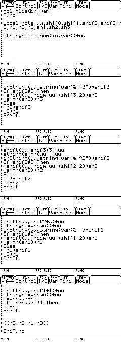 Diese Funktion liefert nun auf einem TI92+ für Polynome (bis x^3) die zugehöriegen Glieder als Vektor. zb: :polyglie(s^3*T3*k1 + s + 5*k1,s) :[T3*k1 0 1 5*k1] Gruß Zoltan