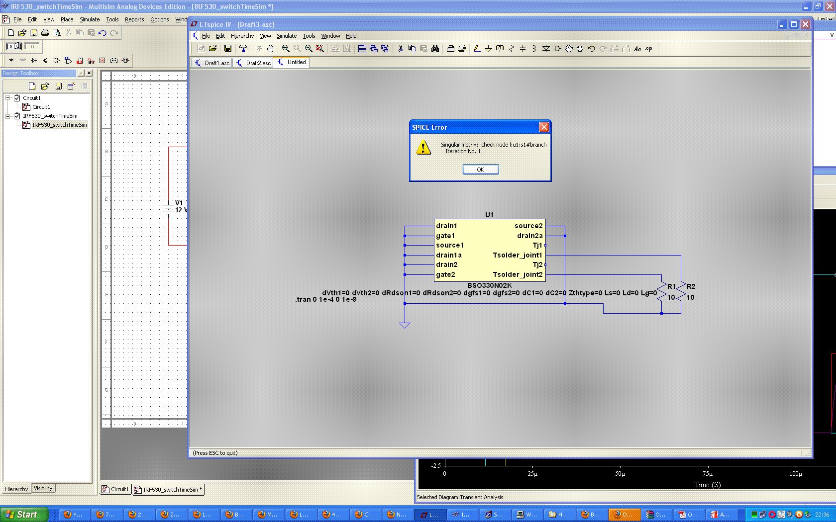 Hallo, ich habe mich heute zum ersten mal an LTspice herangemacht. Habe frueher aber schon mit Pspice Erfahrungen sammeln koennen. Ich habe ein Modell des BSO330 von Infineon (N-MOS) heruntergeladen (http://www.infineon.com/dgdl/OptiMOS2_20V_25V_30V_PSpice.zip?folderId=db3a3043156fd573011622e10b5c1f67&fileId=db3a304320d39d59012110241ceb3687) und dieses in LTspice integriert, indem ich die .lib datei geoeffnet und mit der entsprechenden ".SUBCKT"-Zeile ein Schaltsymbol erzeugt habe. Soweit so gut. Leider funktioniert die Simulation nicht. Es kommt die Fehlermeldung : "Singular matrix: check node I:u1:s1#branch Iteration No. 1" (siehe Bild) Das ganze kommt wenn ich auf "Run" druecke nach ca. 2 Sekunden. In der Statuszeile huschen ein paar Meldungen durch, irgendwas mit GMIN, newton-irgendwas-blah ect. Er rechnet also schon ein bischen was (DC-bias-point oder so). Nun kenne ich ja die Tuecken von Pspice ein wenig, z.B. Probleme mit (fast) floatenden Schaltungsteilen wo man dann ein paar 1G Widerstaende einbauen musz aber hier stecke ich total fest. Die Schaltung hatte urspruenglich mehr Sinn, ich hatte einen Transistor benutzt und den anderen wie hier komplett auf Masse. Die Testschaltung mit einem NMOS aus LTspice hatte auch funktioniert. Nur diesen BSO330 krieg ich nicht zum laufen. Habt ihr eine Idee fuer mich ?