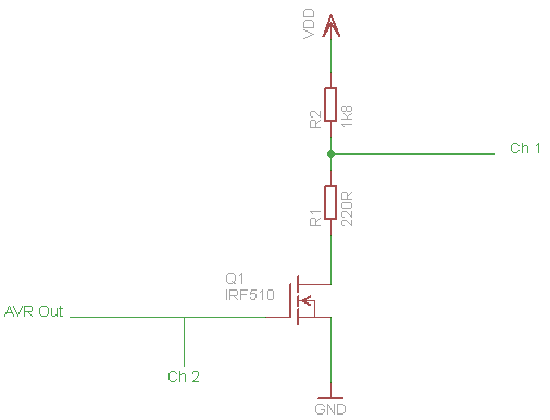 Hallo zusammen, ich baue gerade ein LED-Array (für eine wissenschaftliche Anwendung), auf dem Reihen mit bis zu 36 700mA LEDs 1.) in verschiedenen Helligkeiten leuchten müssen und 2.) schnell ein- und ausgeschaltet werden müssen. Das ganze wird eine Beleuchtung für Aufnahmen mit einer High Speed Kamera, die Bilder mit 6kHz aufnimmt. Die Details sind an dieser Stelle wohl irrelevant, die technischen Parameter vielleicht nicht: Ich muss ca. 700mA, 80V schalten, die LEDs sollen kürzestenfalls nur ca. 4us leuchten. Im Anhang mein erster Testaufbau (Widerstände statt LEDs, habe statt einem IRF510 die Logic Level Version IRL510) und das Ergebnis auf dem Oszi. Ich bin Physiker, kein Elektroniker und habe nicht viel Erfahrung mit solchen Schaltungen, vielleicht kann mir jemand helfen das Ergebnis zu interpretieren, insbesondere: 1.) woher kommen die Überschwinger am Gate? 2.) Wieso dauert der Abschaltvorgang so lange (ca. 1us auf der Lastseite, obwohl die Gate-Spannung ausreichend schnell abfällt)? Daran anschließend: Wie kann ich die Schaltung verbessern, damit der Schaltvorgang zuverlässig und schnell läuft (mit minimalem zusätzlichen Bauteileinsatz)? Vielen Dank für eure Hilfe, Daniel